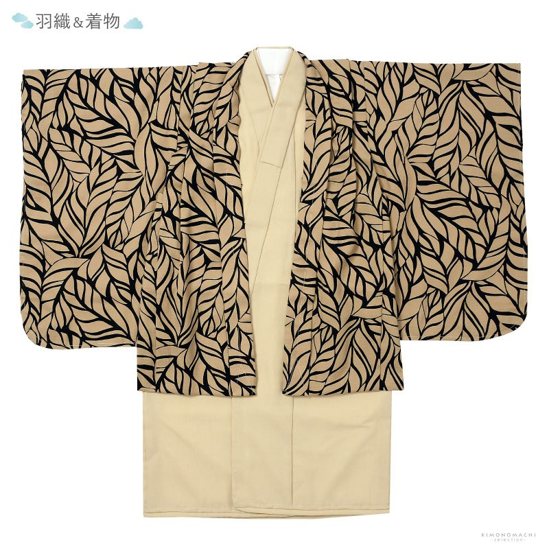 【色柄】羽織は茶色みのベージュ地に黒の線で表現されたリーフ柄。着物は浅いベージュ。共布の重ね衿。襦袢は白。袴は紺にわずかなラメ感のある横に織り筋が入った生地。袴と共生地の帯、懐剣、お守り袋。革紐にメタルパーツの羽織紐。