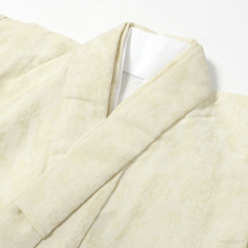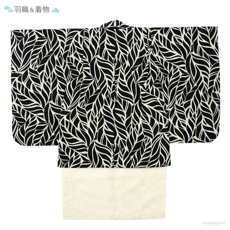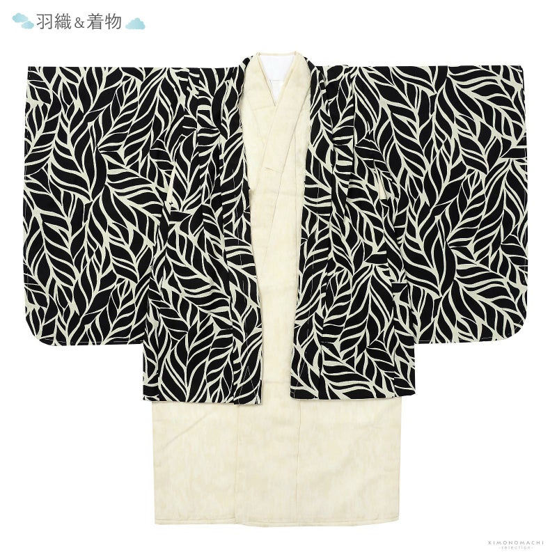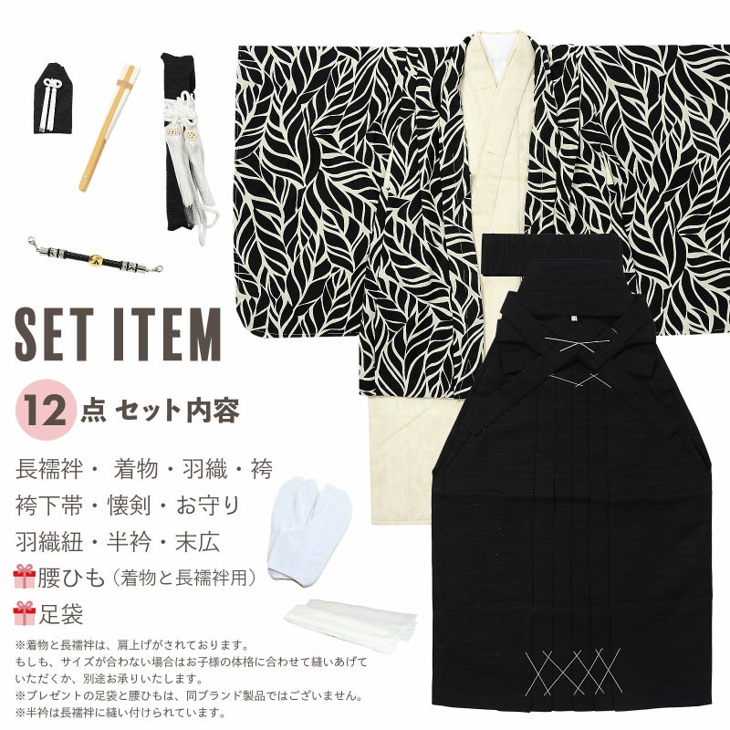 【色柄】羽織は黒地にオフホワイトの線で表現されたリーフ柄。着物は、木目調の地模様のある象牙色。共布の重ね衿。襦袢は白。袴は黒にわずかなラメ感のある横に織り筋が入った生地。袴と共生地の帯、懐剣、お守り袋。革紐にメタルパーツの羽織紐。
