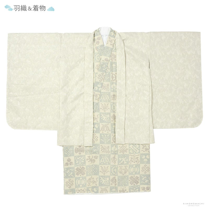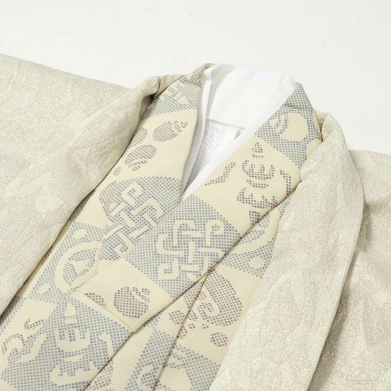 羽織はややグレイッシュな白に金銀の細かなラメ感のある地。花のような抽象的な文様が織り出されています。