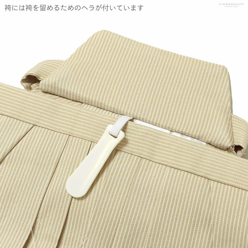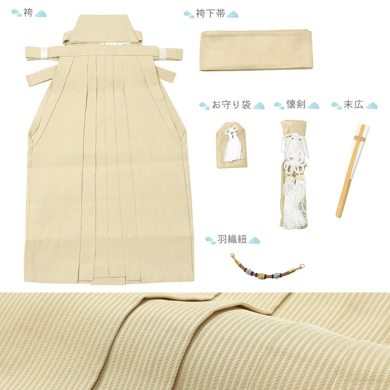 袴はベージュの細かなストライプ。帯はベージュ。懐剣、お守り袋もベージュ。白茶の紐にメタルパーツの羽織紐。