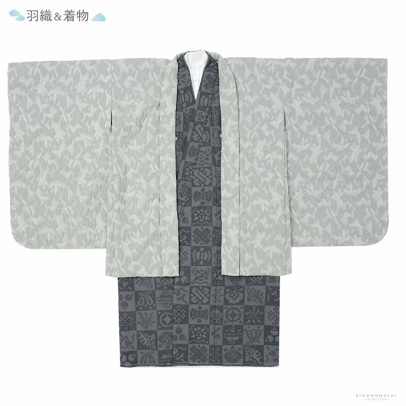 羽織はグレーに銀の細かなラメ感のある地。花のような抽象的な文様が織り出されています。