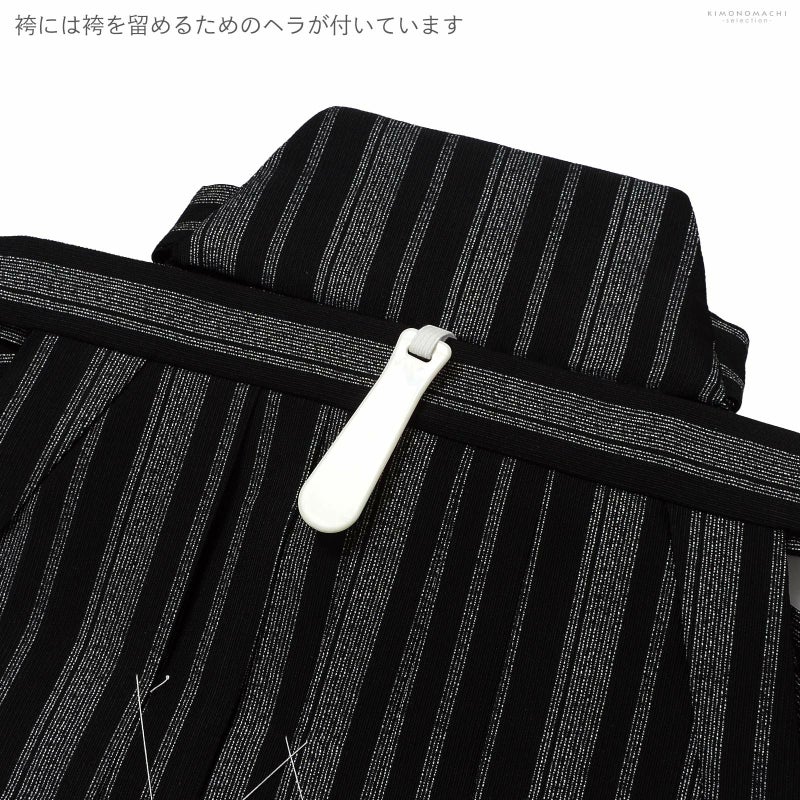袴は黒地に細い白の滝縞。帯はシルバーグレー。懐剣、お守り袋もシルバーグレー。黒の紐にメタルパーツの羽織紐。