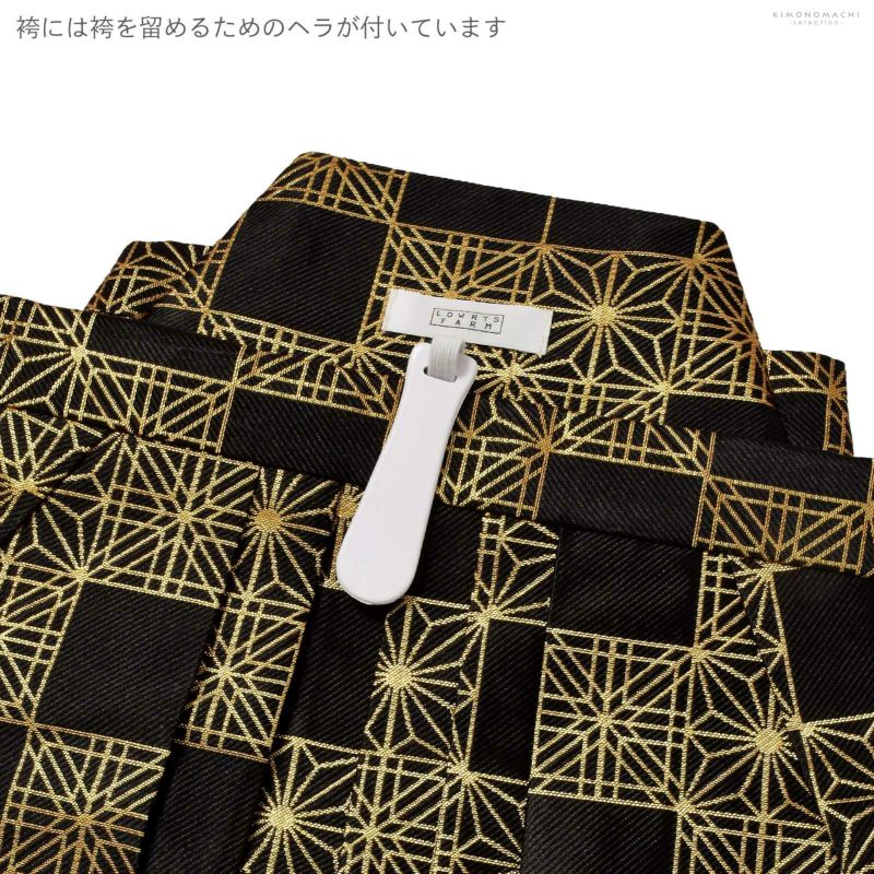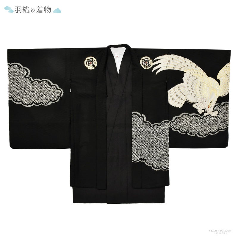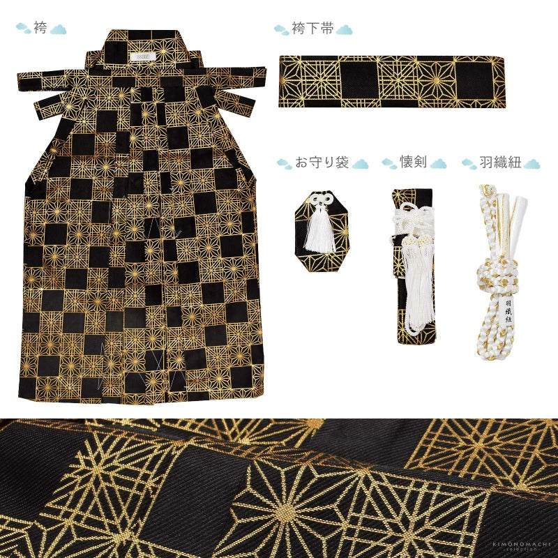 羽織は紗綾形の地模様の黒地。背にはアイボリーにグレー、紅色の挿し色の入った白鷹。鹿の子の雲。マットな金彩が気品のある印象です。着物は黒。白の襦袢がついています。袴は黒茶の地にゴールドの変わり麻の葉文様。共布の帯と懐剣、お守り袋。白とゴールドの羽織紐。