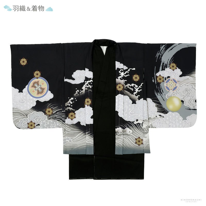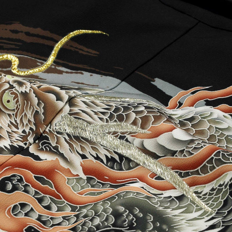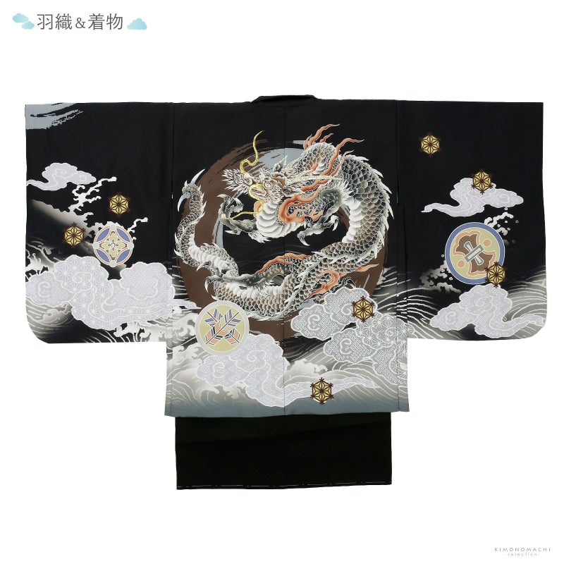 羽織は黒地に灰色の裾ぼかし、薄いグレーの雲に波。背には茶色と青灰色の円相。その上に白に墨色、赤茶の龍。角やひげの金銀の刺繍が豪壮な煌びやかさを添えます。宝尽くしの丸紋や結晶のような形の麻の葉紋。