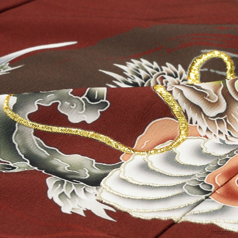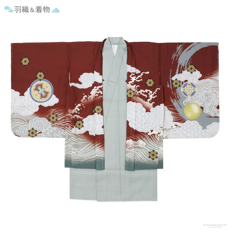 羽織はやや浅い赤茶色地、裾に藍鼠色のぼかし、薄いグレーの雲に波。背には茶色と青灰色の円相。その上に白に墨色、赤茶の龍。角やひげの金銀の刺繍が勇壮な煌びやかさを添えます。宝尽くしの丸紋や結晶のような形の麻の葉紋。