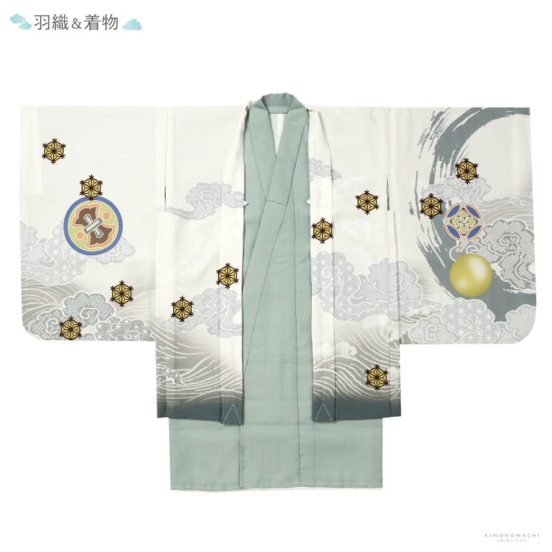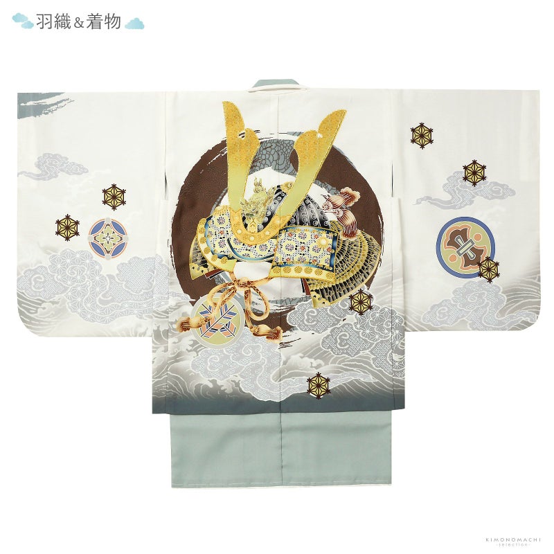 羽織は白地に青磁色の裾ぼかし、薄いグレーの雲に波。背の茶色と青灰色の円相の中には龍が表現されています。その上に金茶、薄黄色の鍬形に獅子の前立て、薄黄、臙脂の小紋や墨色の兜。宝尽くしの丸紋や結晶のような形の麻の葉紋。ポイントに金彩や金糸の刺繍が煌びやかさを添えます。