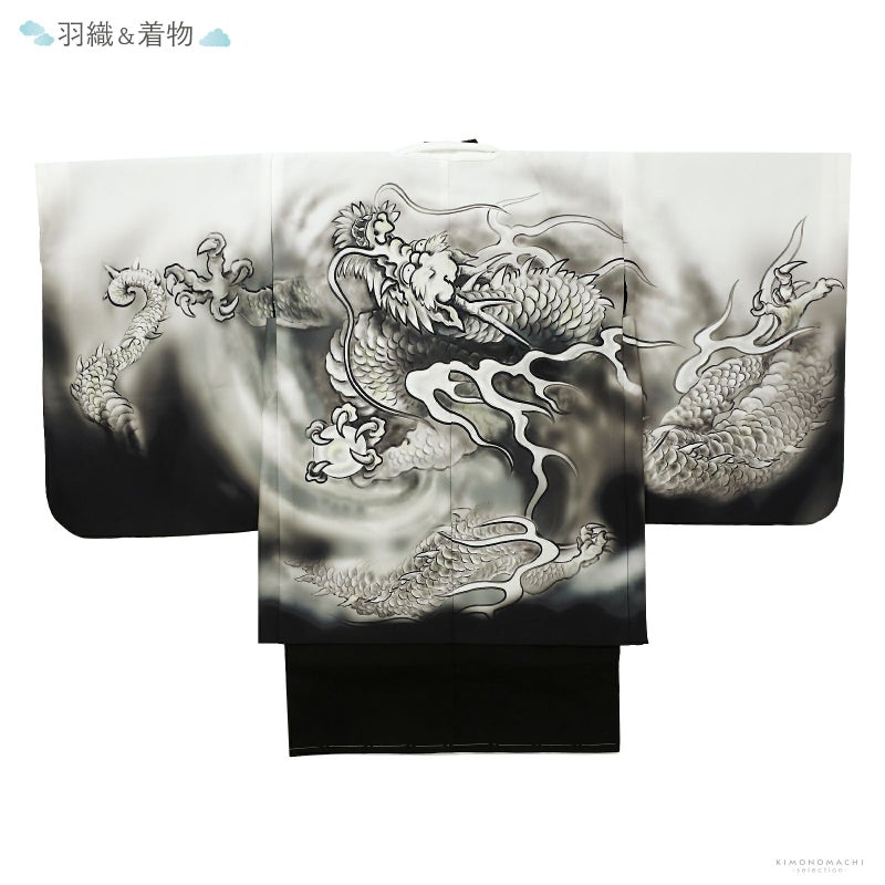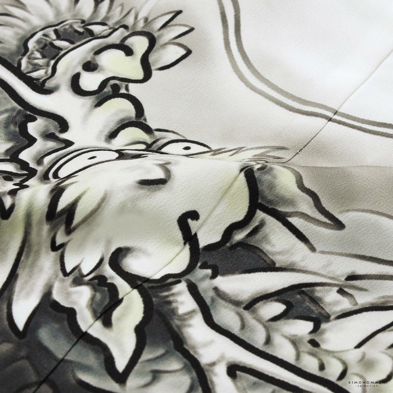 羽織は白地、肩から下にかけて墨黒でぼかした渦の中から姿を現す龍が水墨画調で表現されています。墨色、グレージュ、白にわずかに挿された淡い黄色の抑えた配色が荘厳な雰囲気。