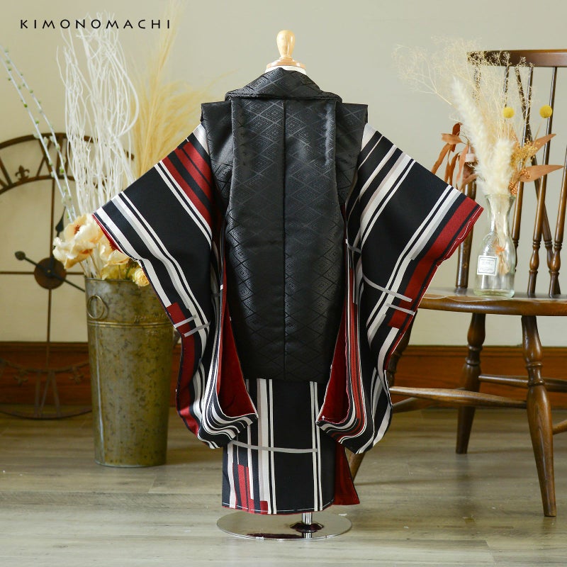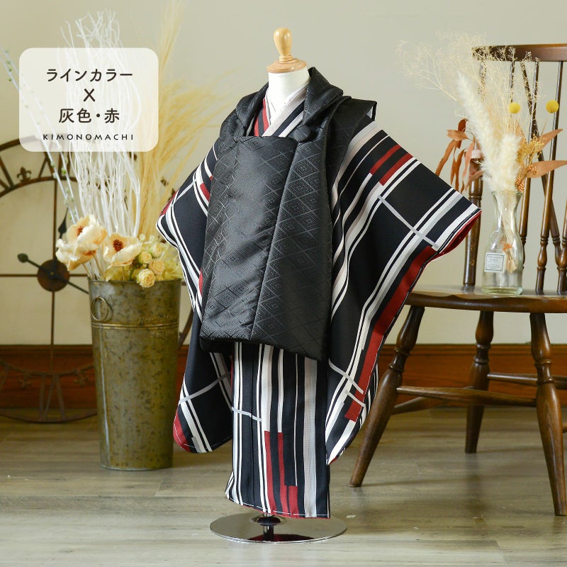 3. 七五三 3歳 着物 単品「ラインカラー 灰色×赤」子供着物 三才のお祝い着 3才向け 小紋 KIMONOMACHI オリジナル【メール便不可】