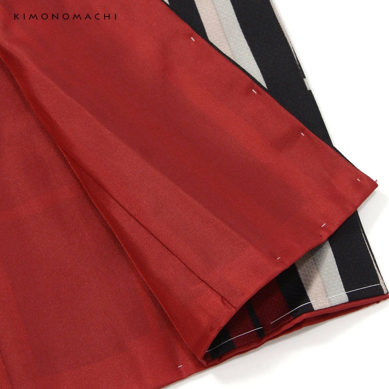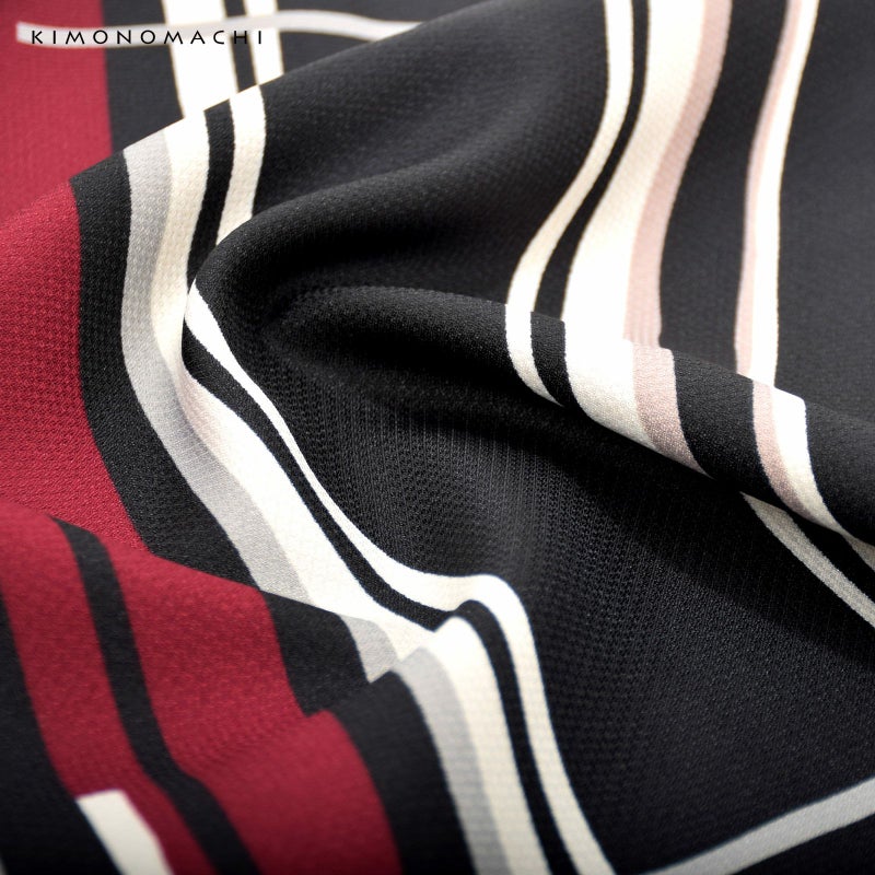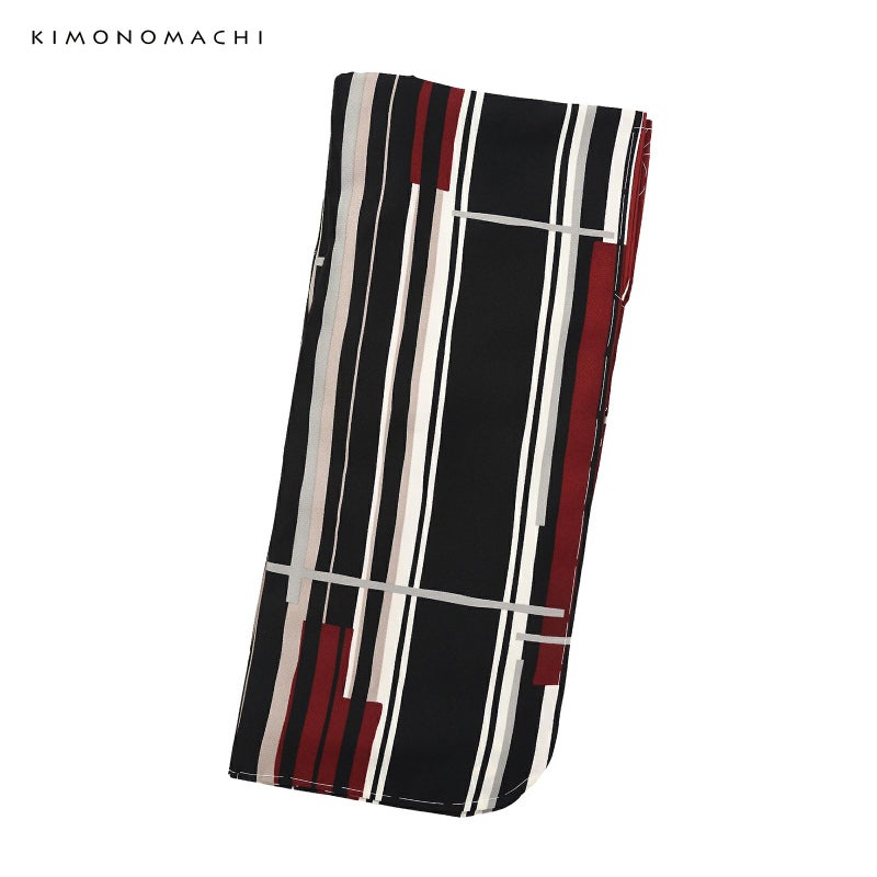 【色柄】細かな地模様のある生地。黒をメインに、白、深い紅色にグレー、やや赤みのグレージュのランダムな縞。ところどころグレーのラインが横切るデザイン。スタイリッシュな格好良さとレトロな雰囲気を併せ持っています。裏地は臙脂。