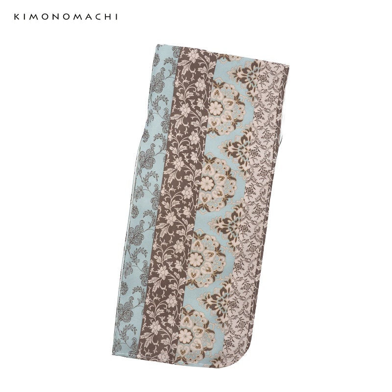【色柄】細かな地模様のある生地。全体的にグレイッシュな色合いの浅い水色、ベージュ、薄茶色の縦縞。その中にやや鮮やかな水色、薄水色の挿し色が入った大きな華紋や、桃唐草、ペイズリー風の草花など様々な唐草文様。ミントチョコのような現代的な色使いとオリエンタルな文様がお洒落なデザインです。裏地は白。