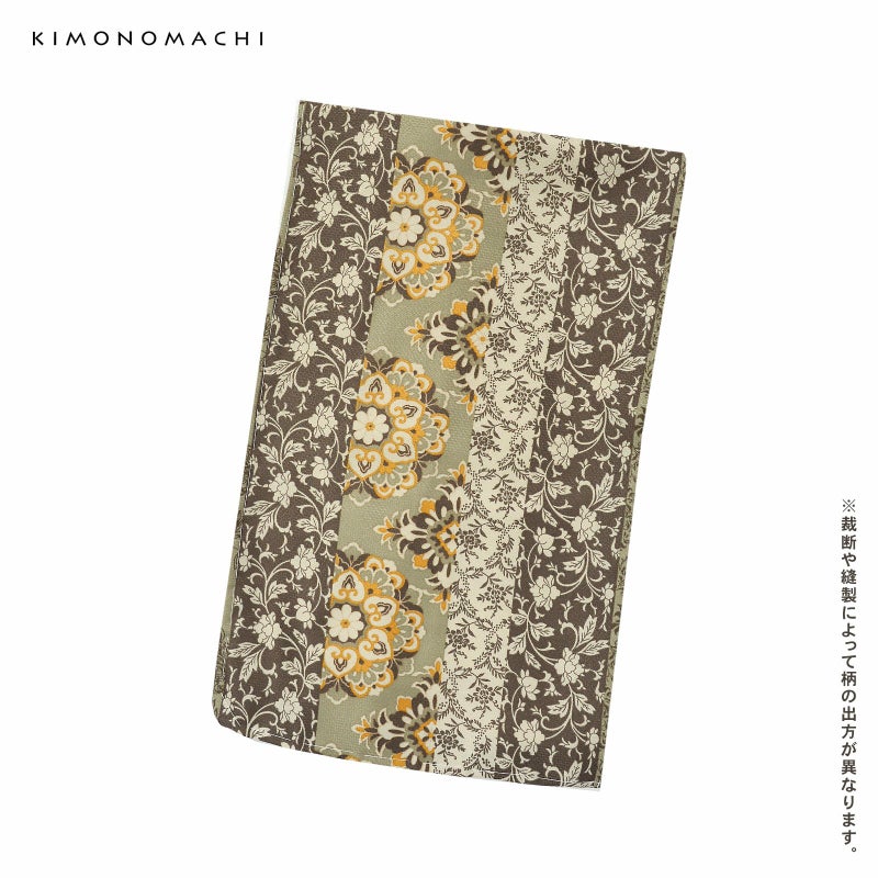 【色柄】細かな地模様のある生地。全体的にグレイッシュな色合いのカーキ、ベージュ、薄茶色の縦縞。その中に浅い山吹色の挿し色が入った大きな華紋や、桃唐草、ペイズリー風の草花など様々な唐草文様。落ち着いた色合いの中に、オリエンタルな魅力溢れるデザインです。裏地は白。