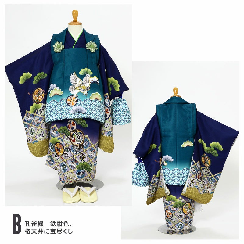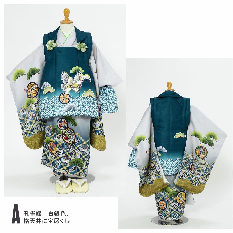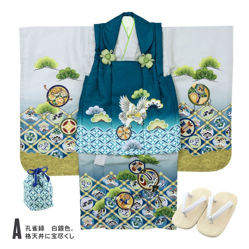 七五三 着物 3歳 男の子 被布セット「孔雀緑 白銀色・孔雀緑 鉄紺色・裏柳色 白・裏柳色 孔雀緑・白 裏柳色・白 黒色、格天井に宝尽くし」三歳男児被布セット 子供着物 フルセット 三才のお祝い着 3才向け【メール便不可】