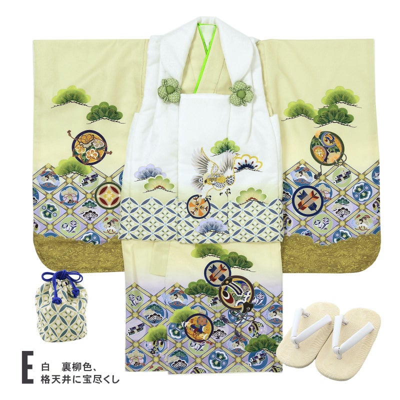 E.白 裏柳色、格天井に宝尽くし:被布コートは白地。淡いグレー系の鷹に緑の松。ポイントにゴールドの刺繍。裾模様に白緑に灰青の七宝文様。被布飾りは抹茶色の鹿の子のつまみのお花。着物は細かな地模様のあるグレイッシュな薄い黄緑色の地。浅い藤色の裾ぼかしに宝尽くし紋を詰めた格天井、雲。その上に丸紋。重ね衿は黄緑色。白の長襦袢。巾着は白緑に灰青の花菱七宝文様、持ち手はブルー。白い鼻緒の雪駄。