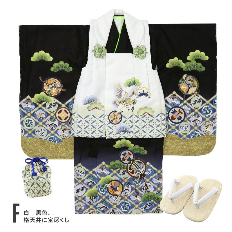 F.白 黒色、格天井に宝尽くし:被布コートは白地。淡いグレー系の鷹に緑の松。ポイントにゴールドの刺繍。裾模様に白緑に灰青の七宝文様。被布飾りは抹茶色の鹿の子のつまみのお花。着物は細かな地模様のある黒地。浅い灰青の裾ぼかしに宝尽くし紋を詰めた格天井、雲。その上に丸紋。重ね衿は黄緑色。白の長襦袢。巾着は白緑に灰青の花菱七宝文様、持ち手はブルー。白い鼻緒の雪駄。