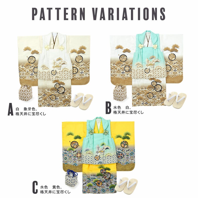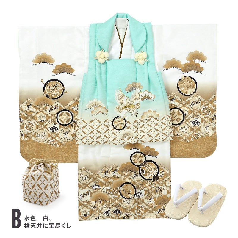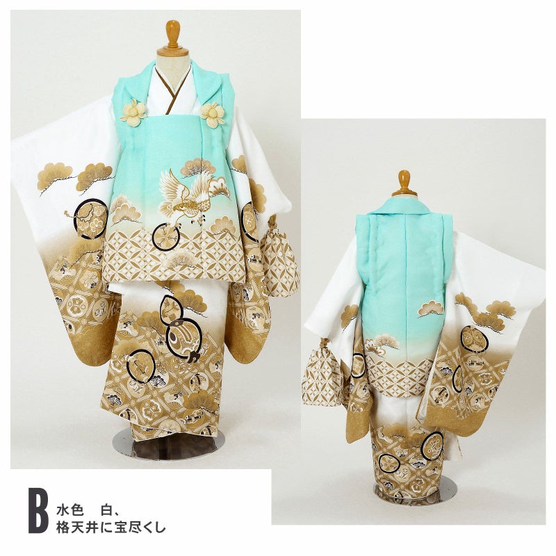 B.水色 白、格天井に宝尽くし:被布コートはミント系の明るい水色の地。淡いベージュ系の鷹に松。ポイントにゴールドの刺繍。裾模様にベージュに白茶の七宝文様。被布飾りはアイボリーの鹿の子のつまみのお花。着物は細かな地模様のある白地。浅い茶色の裾ぼかしに宝尽くし紋を詰めた格天井、雲。その上に丸紋。重ね衿は茶色。白の長襦袢。巾着はベージュの地に白茶の花菱七宝文様。