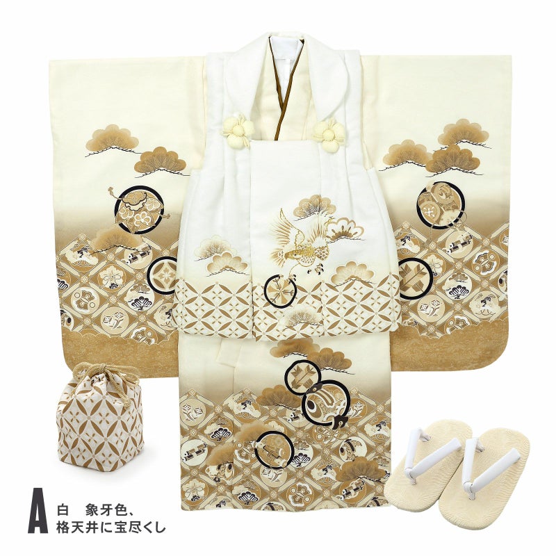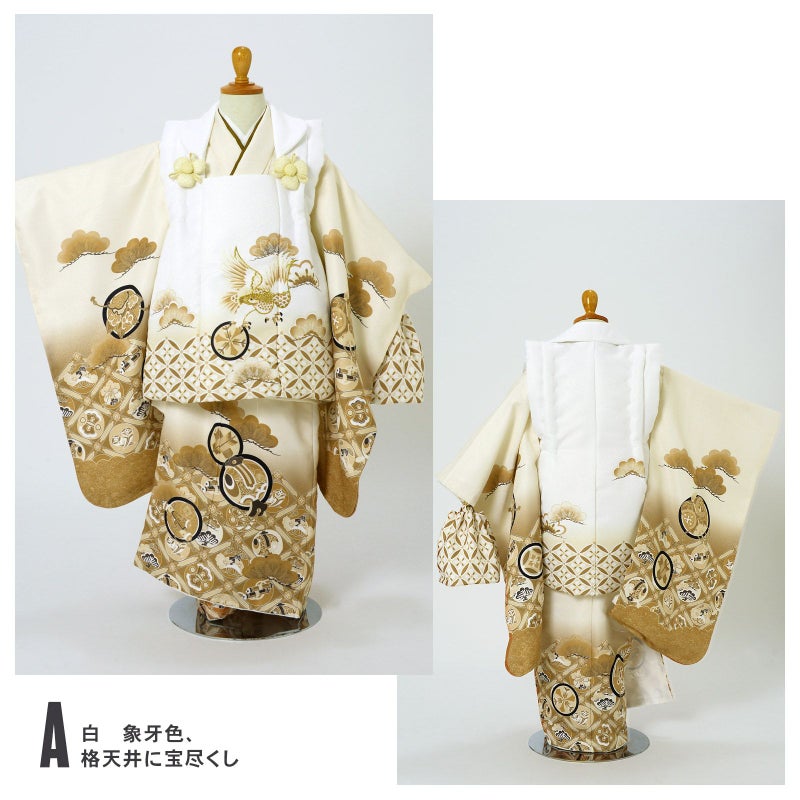A.白 象牙色、格天井に宝尽くし:被布コートは白地。淡いベージュ系の鷹に松。ポイントにゴールドの刺繍。裾模様にベージュに白茶の七宝文様。被布飾りはアイボリーの鹿の子のつまみのお花。着物は細かな地模様のある象牙色の地。白茶色の裾ぼかしに宝尽くし紋を詰めた格天井、雲。その上に丸紋。重ね衿は茶色。白の長襦袢。巾着はベージュの地に白茶の花菱七宝文様。