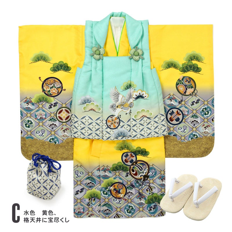 C.水色 黄色、格天井に宝尽くし:被布コートはミント系の明るい水色の地。白にブルーグレーの鷹に薄緑の松。ポイントにゴールドの刺繍。裾模様に浅い黄緑に灰青の七宝文様。被布飾りは抹茶色の鹿の子のつまみのお花。着物は細かな地模様のある明るい黄色地。浅い藤色の裾ぼかしに宝尽くし紋を詰めた格天井、雲。その上に丸紋。重ね衿は黄緑色。白の長襦袢。巾着はベージュの地に浅い黄緑、灰青の花菱七宝文様、持ち手はブルー。