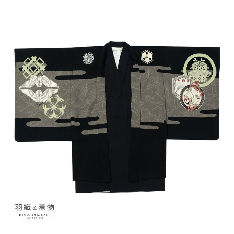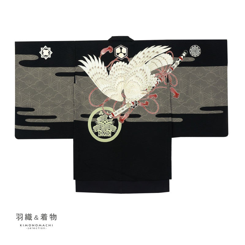 羽織は紗綾形の地模様の黒地。浅いウォームグレーの霞取りの中に松竹梅の青海波。背にはアイボリーにベージュ、紅藤鼠色の挿し色の入った白鷹。錆赤の下げ緒のついた刀。背や袖に剣三つ折れ鷹紋、剣三つ折れ鷹紋、組合せ枡に鷹の羽紋が配置されています。他に青磁色の丸紋、小槌や鶴菱など。マットな白金の金彩が気品のある印象です。着物は黒。白の襦袢がついています。袴は黒、グレー、シルバーの縞。共布の帯と懐剣、お守り袋。白とゴールドの羽織紐。