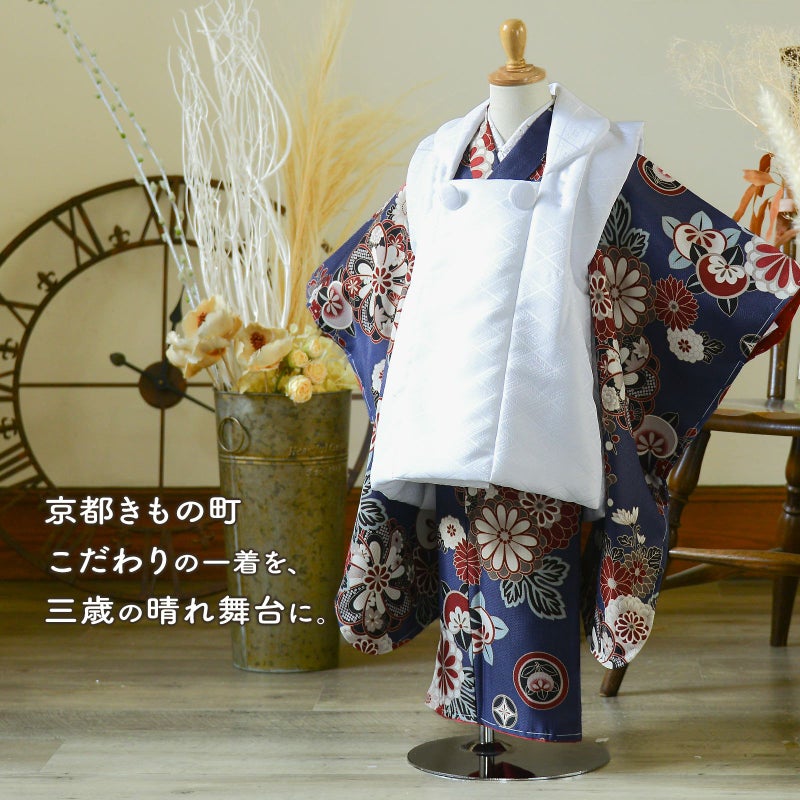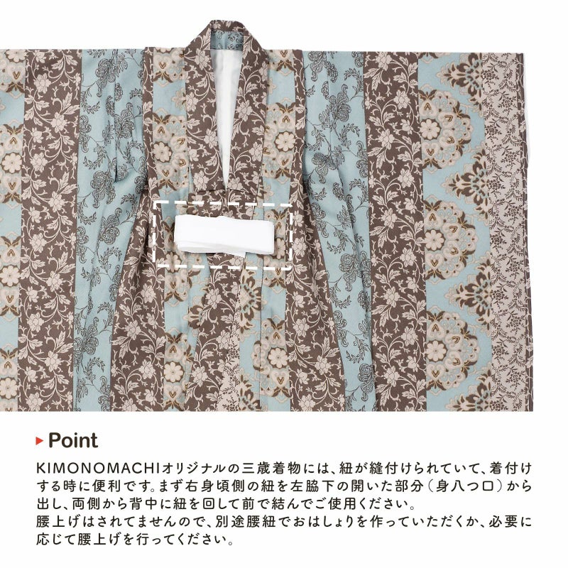 3歳から着られるKIMONOMACHIオリジナルの三歳着物と被布コートの2点セットです。