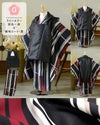 着物:細かな地模様のある生地。黒をメインに、白、深い紅色にグレー、やや赤みのグレージュのランダムな縞。ところどころグレーのラインが横切るデザイン。スタイリッシュな格好良さとレトロな雰囲気を併せ持っています。裏地は臙脂。