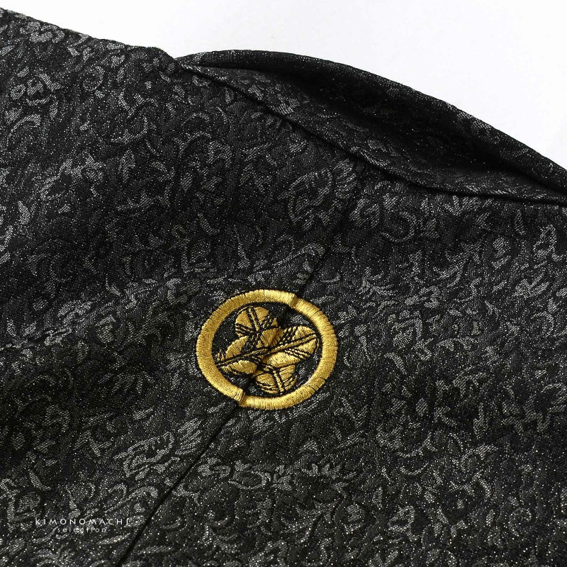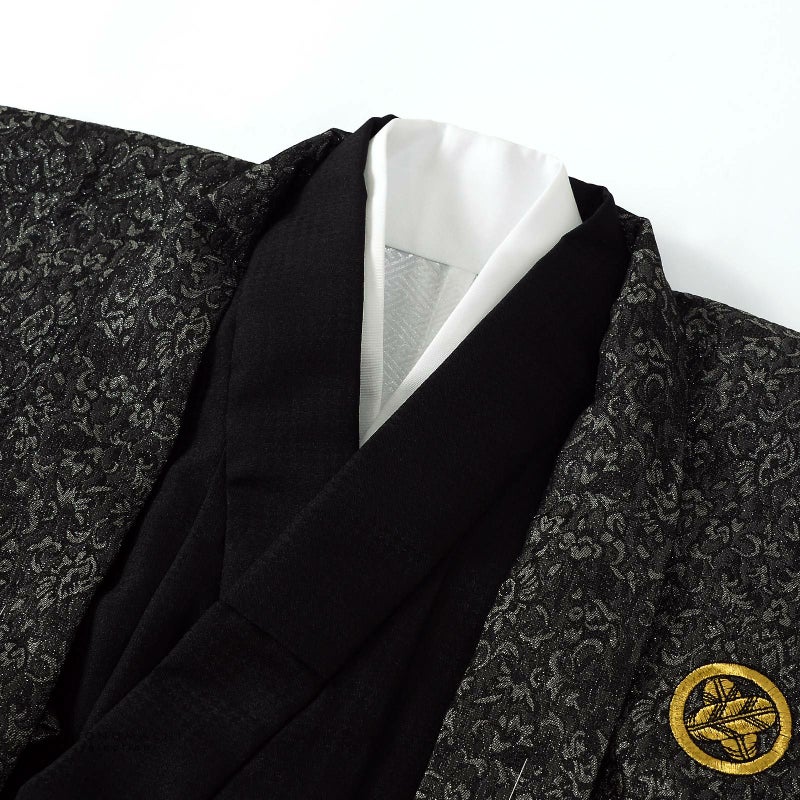 【色柄】羽織はラメ感のあるメタルブラック地に織りで表現された小花のアラベスク文様。背や肩、袖に違い鷹の羽紋の金の刺繍。着物は黒の千鳥格子の地模様。襦袢は白。袴は黒にラメ感のあるシルバーの縦縞。帯は光沢のあるグレー。帯と同色の懐剣、お守り袋。黒のビーズにメタルパーツの羽織紐。