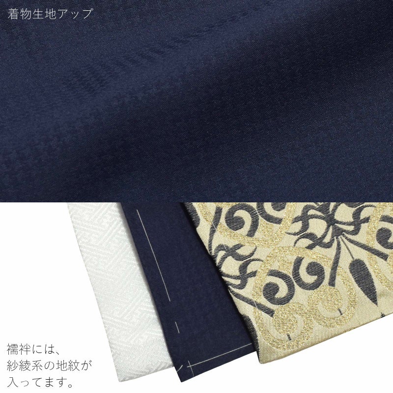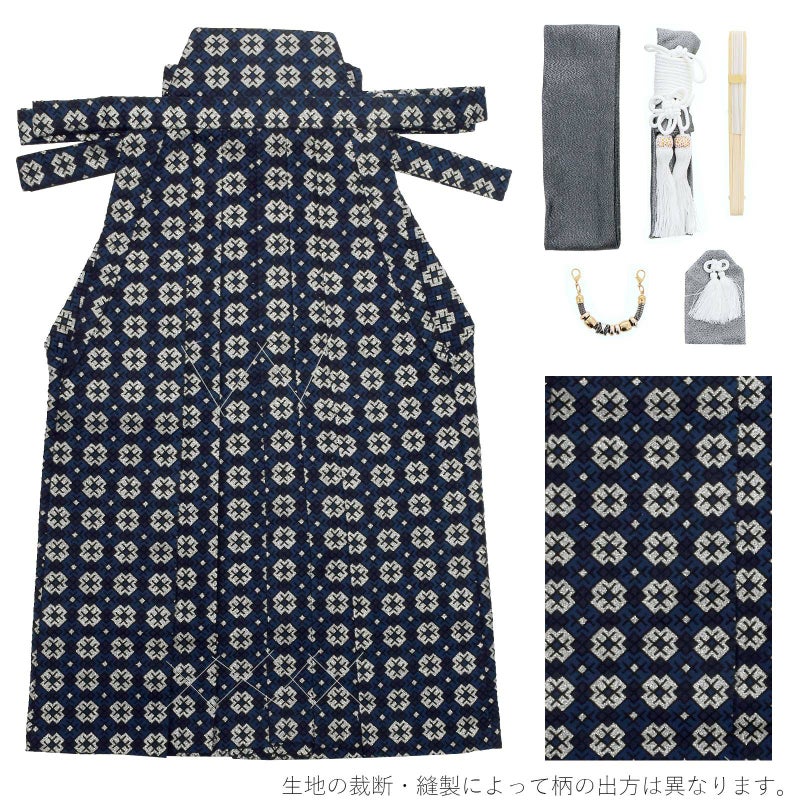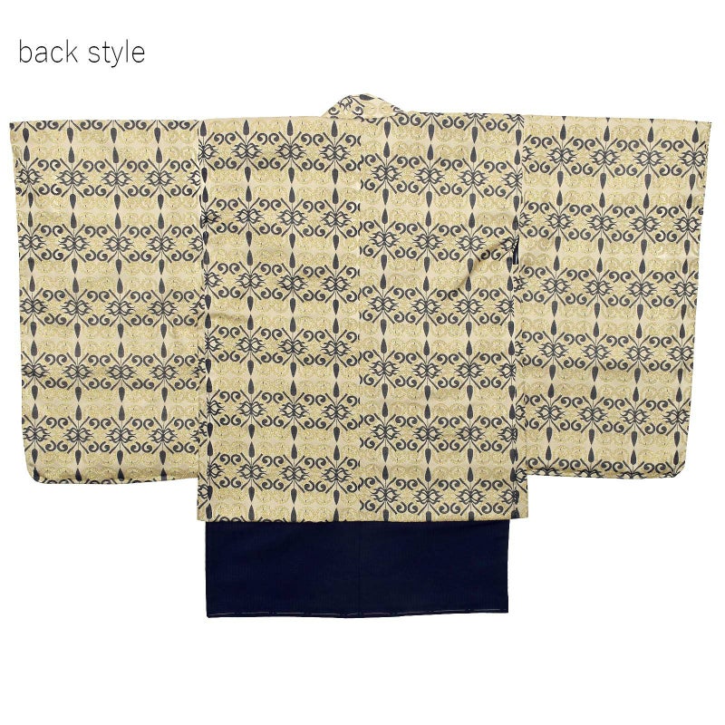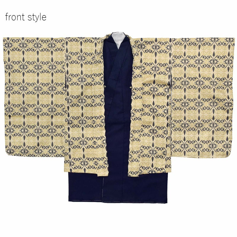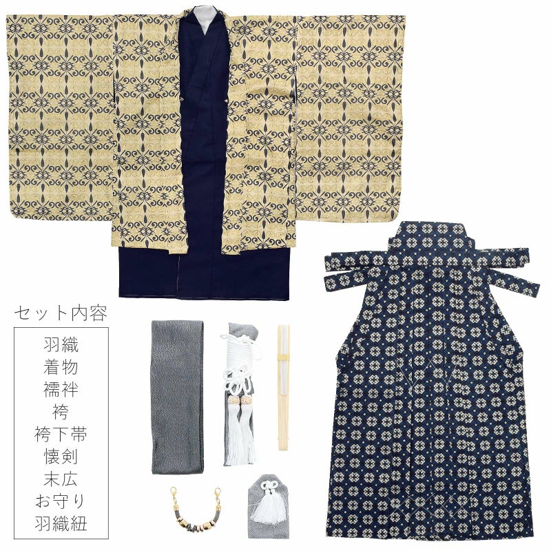 羽織はシャンパンゴールドの地に紺と金の唐草模様。アラベスク調のオリエンタルな雰囲気です。着物はごく細かな千鳥格子の地模様に紺。白の襦袢がついています。袴は黒地に紺と銀の十字と井桁を組み合わせた模様です。ガンメタリックな帯とお守りセット。