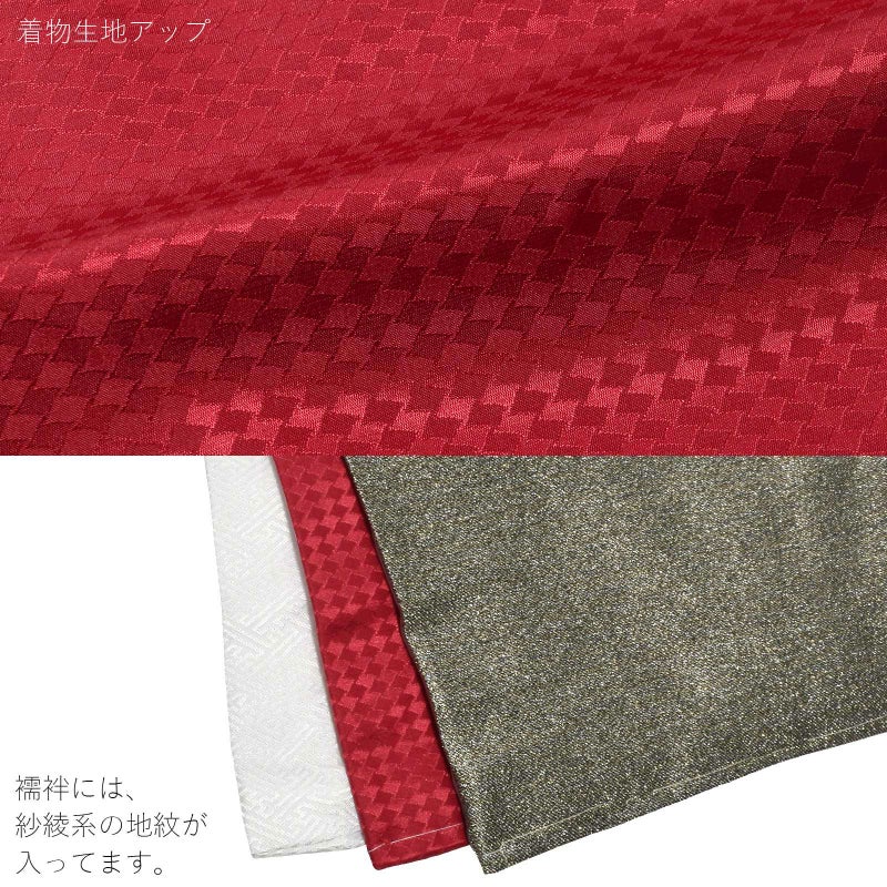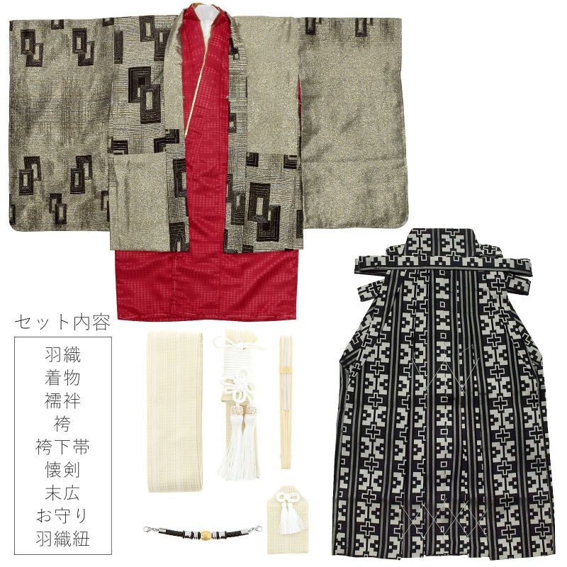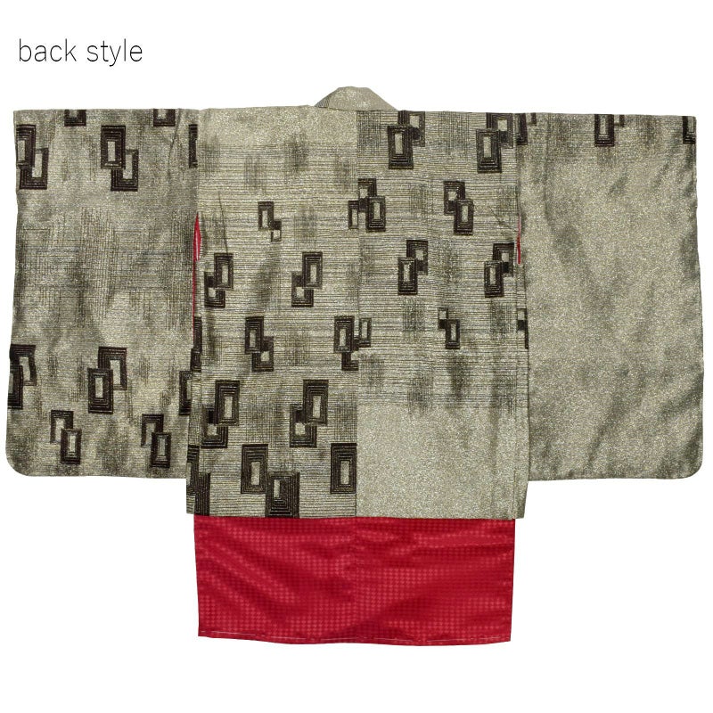 羽織は全体的にキラキラと輝きのあるアッシュゴールドの地に、黒の細い線で不規則な格子、こげ茶と黒の四角を組み合わせた模様。着物は菱形の地模様に深い赤。白の襦袢と金の重ね衿がついています。袴は黒地にグレーの十字を組み合わせた模様です。アイボリーの地に金のラインの帯とお守りセット。