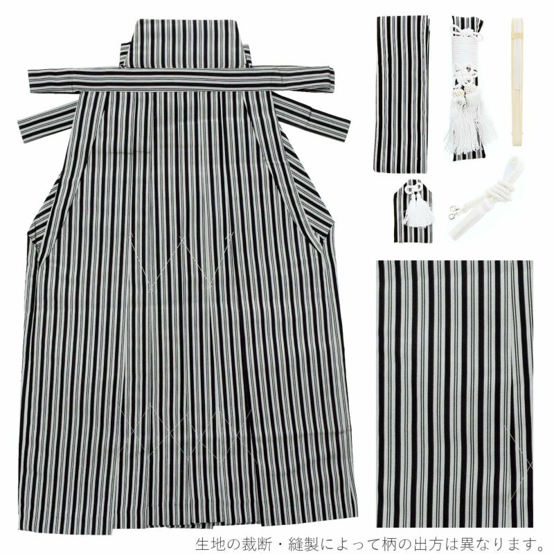 羽織と着物は黒色の地。なめらかで上質な生地感です。白の襦袢がついています。袴は羽織と同系色の黒色と薄灰色の子持ち縞。袴と揃いの生地のお守りセット。派手さを抑えた凛とした雰囲気に。
