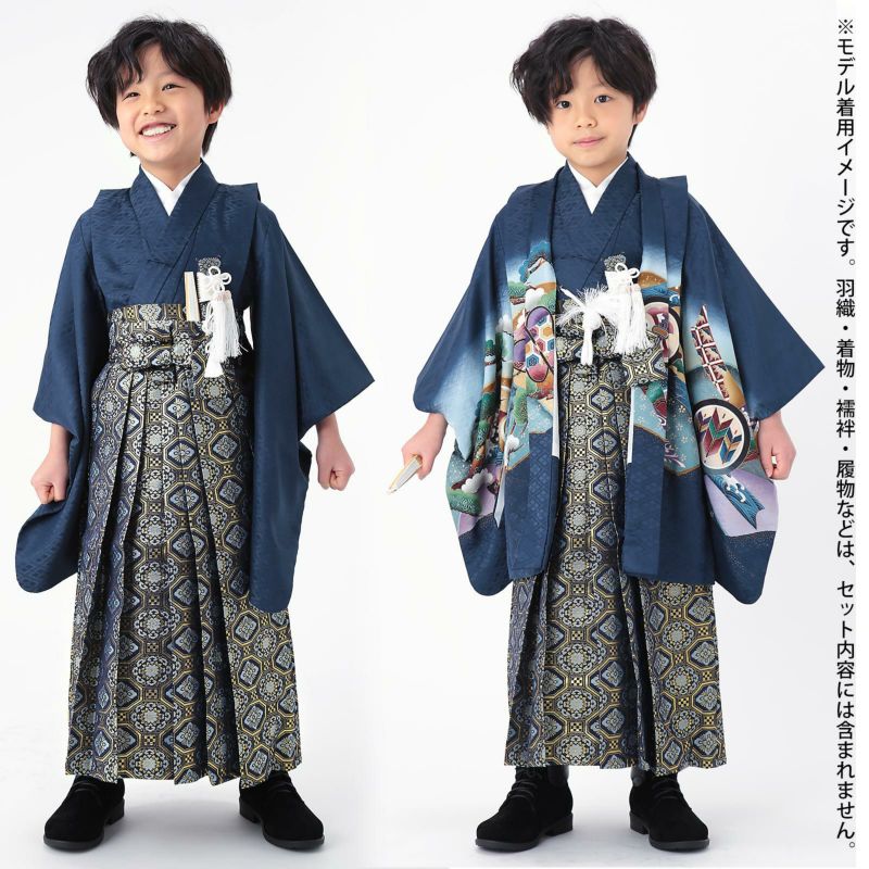 男の子向けの袴、袴下帯、懐剣、お守りの4点セットです。