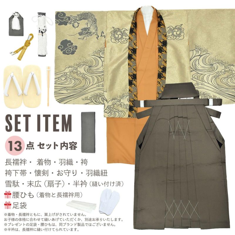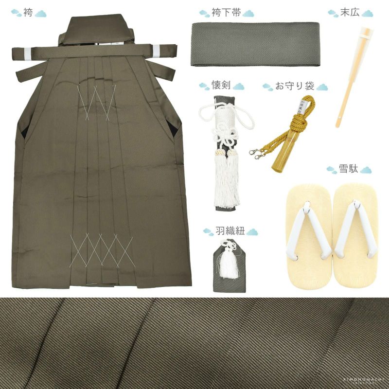 【商品内容】長襦袢・着物・羽織・袴・袴下帯・懐剣・お守り・羽織紐・雪駄・末広(扇子)・半衿(縫い付け済)・腰ひも2本(プレゼント)・足袋(プレゼント)の計13点