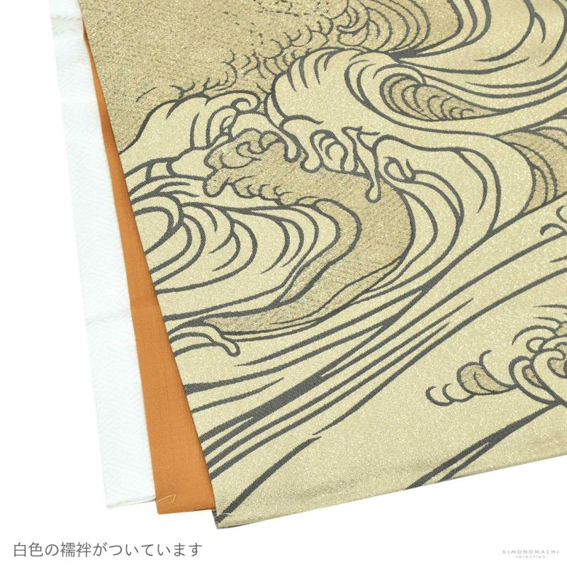 羽織はゴールドの菱の地模様、裾に濃いグレーの荒波。胸に雲と巴紋。袖や背に濃いグレーの雲に龍。衿は黒と金茶の雷紋にブラックシルバーの雲。着物は細かな千鳥格子の金茶色。長襦袢は紗綾形の地模様のある白。袴はチャコールグレー。帯、懐剣はやや緑みのグレー。メタルパーツの羽織紐。末広、白の鼻緒の草履のセットです。