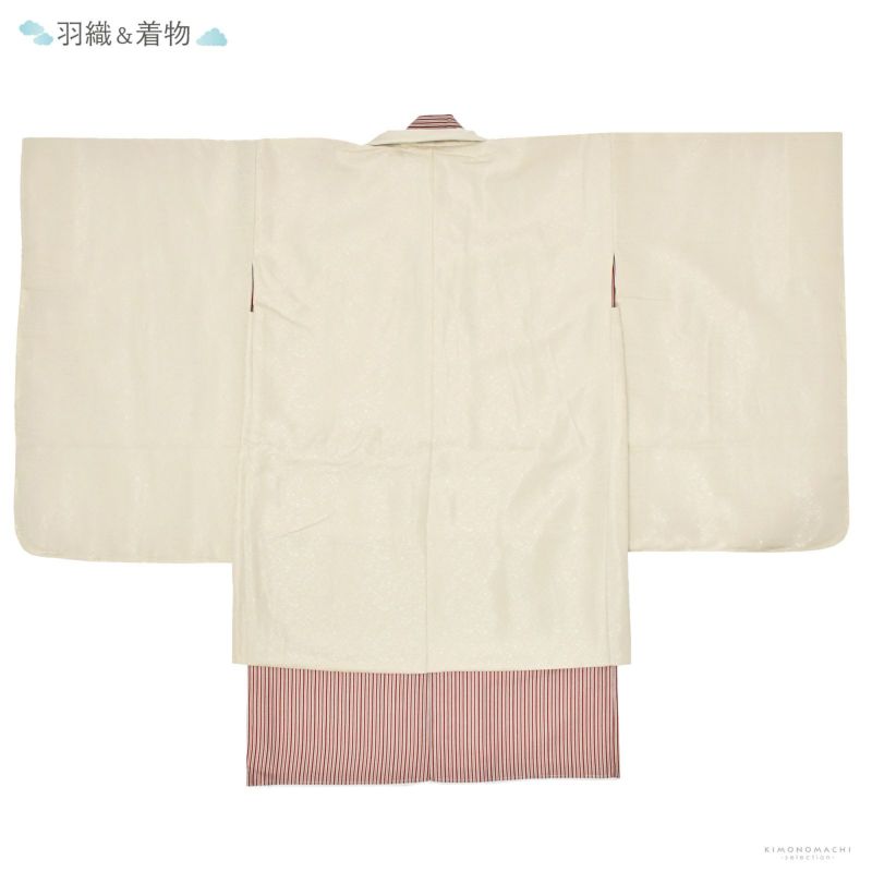羽織はややグレイッシュなアイボリー、細かな唐草の地模様。着物は赤、白茶、オフホワイトの細縞。白の襦袢がついています。袴はミルクティーのようなベージュ。袴と共布の帯、お守り袋、懐剣袋。白の羽織紐、末広。