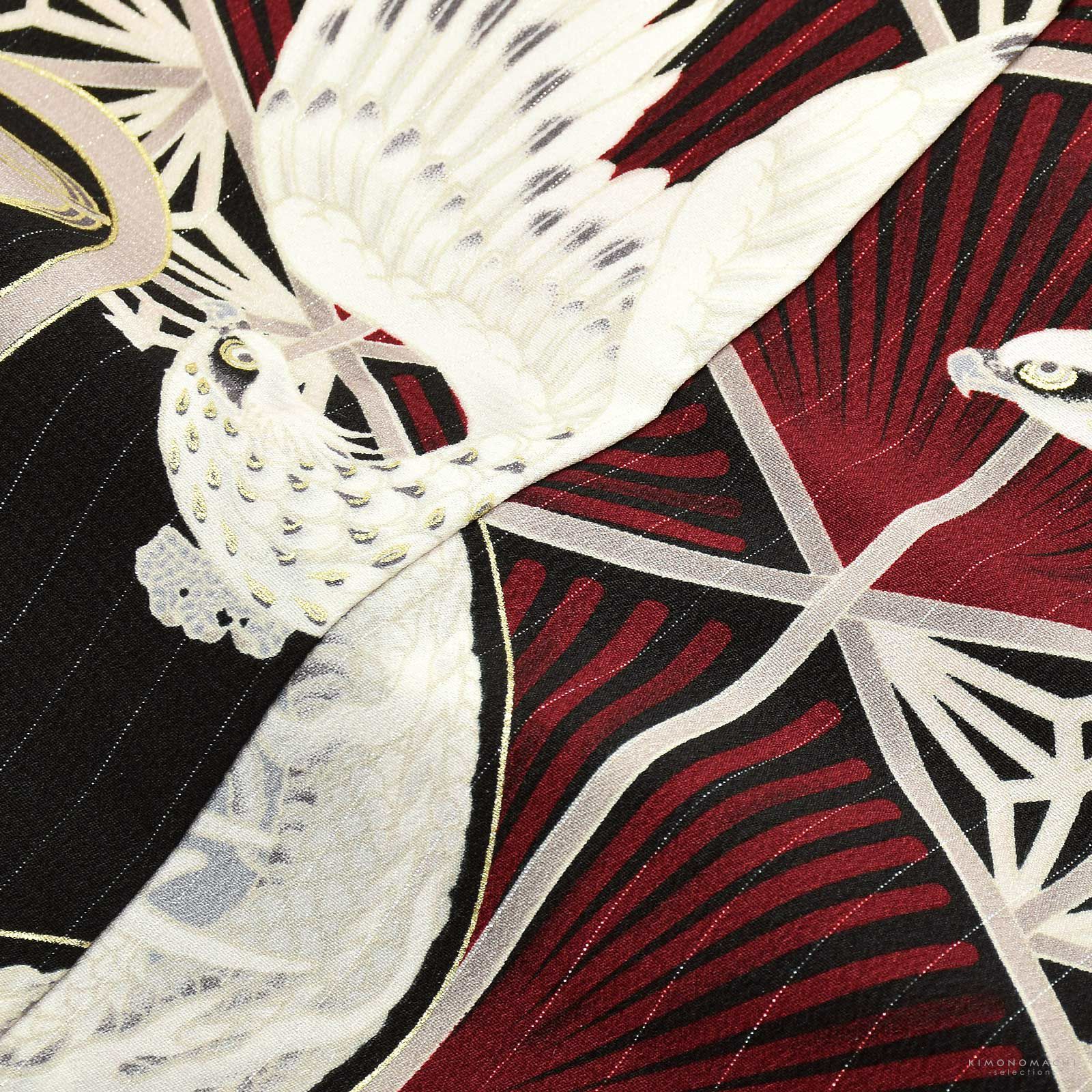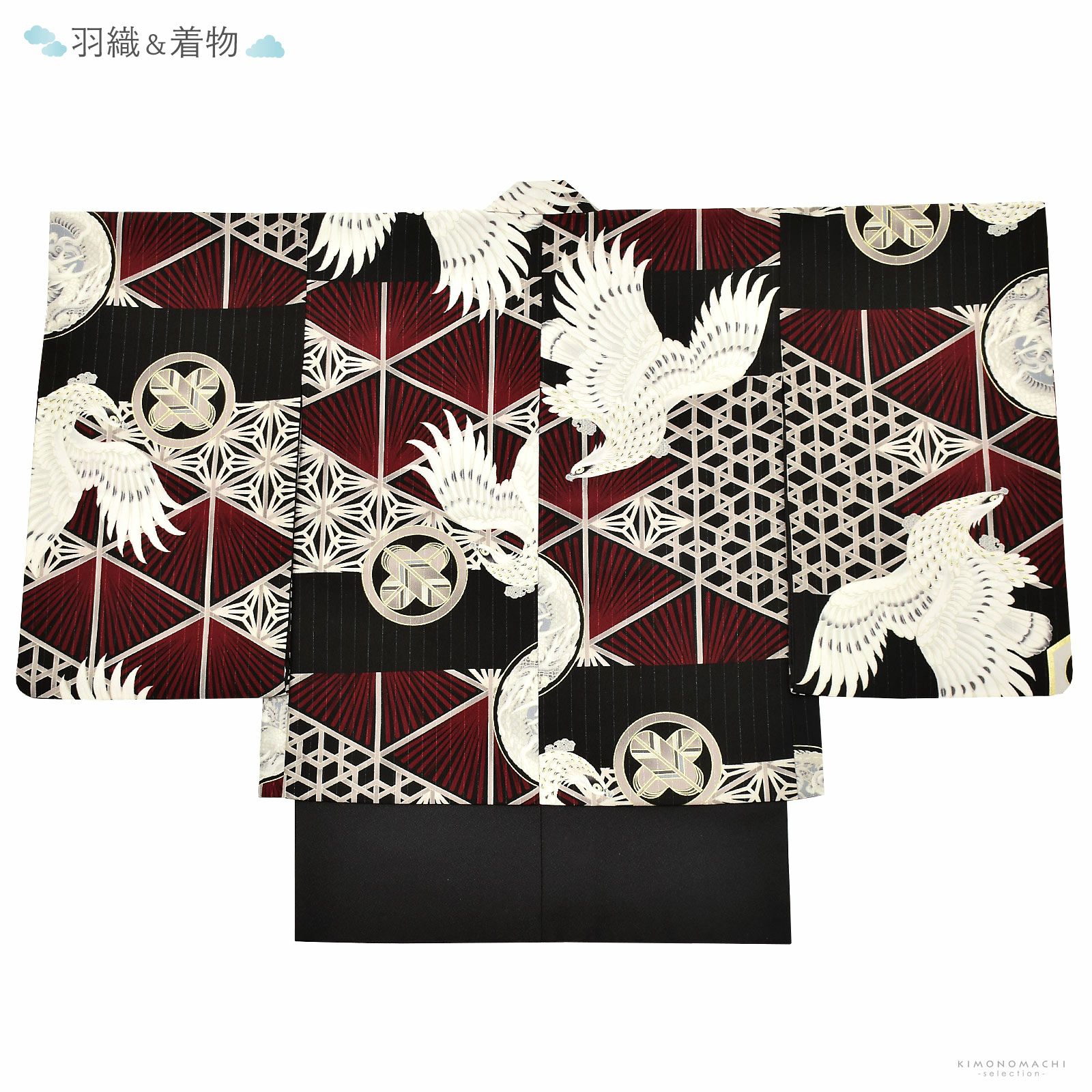 羽織は黒地にシルバーのピンストライプの地。グレージュのラインで菱形に分けられた中に、籠目や麻の葉、深い赤の松菱調の文様。白にグレーの白鷹に金彩、違い鷹の羽の丸紋。着物は黒、襦袢は白。袴はこげ茶色地に黒の菱文。共布の帯。白にメタルパーツやビーズの羽織紐。