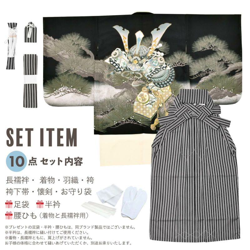 5. 七五三 着物 男の子 5歳 羽織袴セット「黒色 兜に松」フルセット 5歳向け 5才 五歳 男児用 着物セット 子供着物 五才のお祝い着【メール便不可】