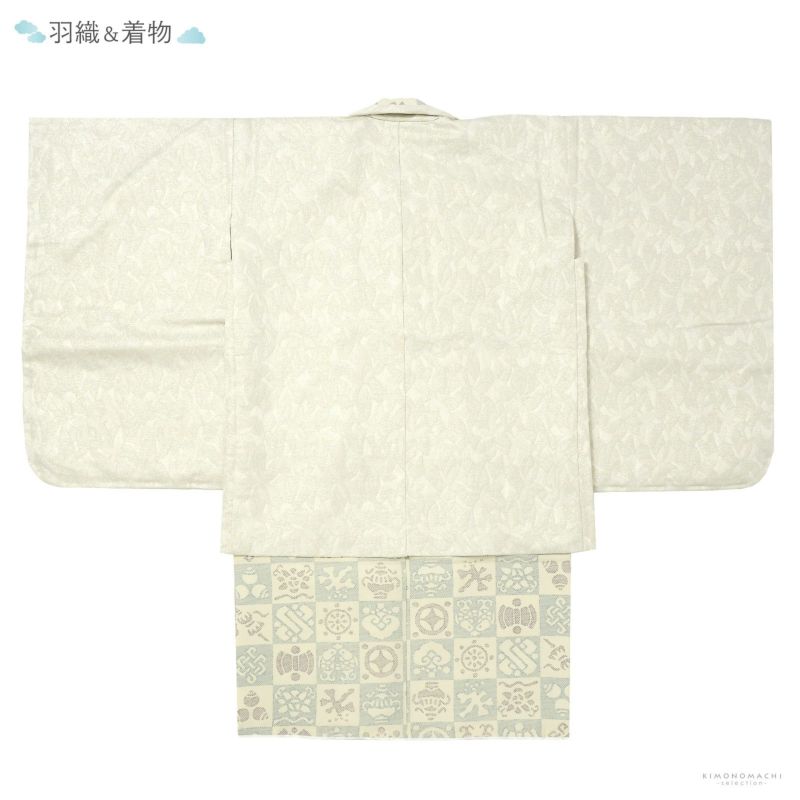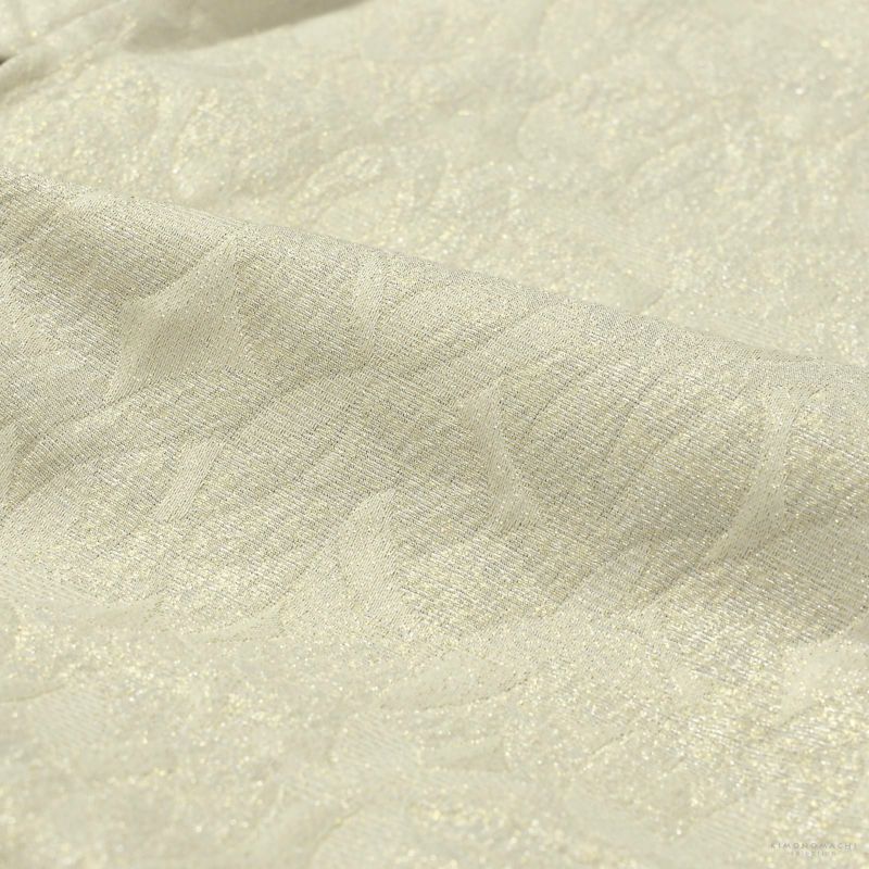 羽織はややグレイッシュな白に金銀の細かなラメ感のある地。花のような抽象的な文様が織り出されています。