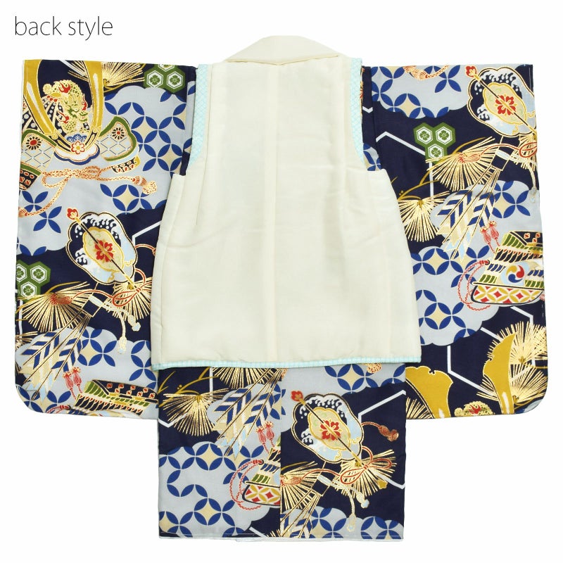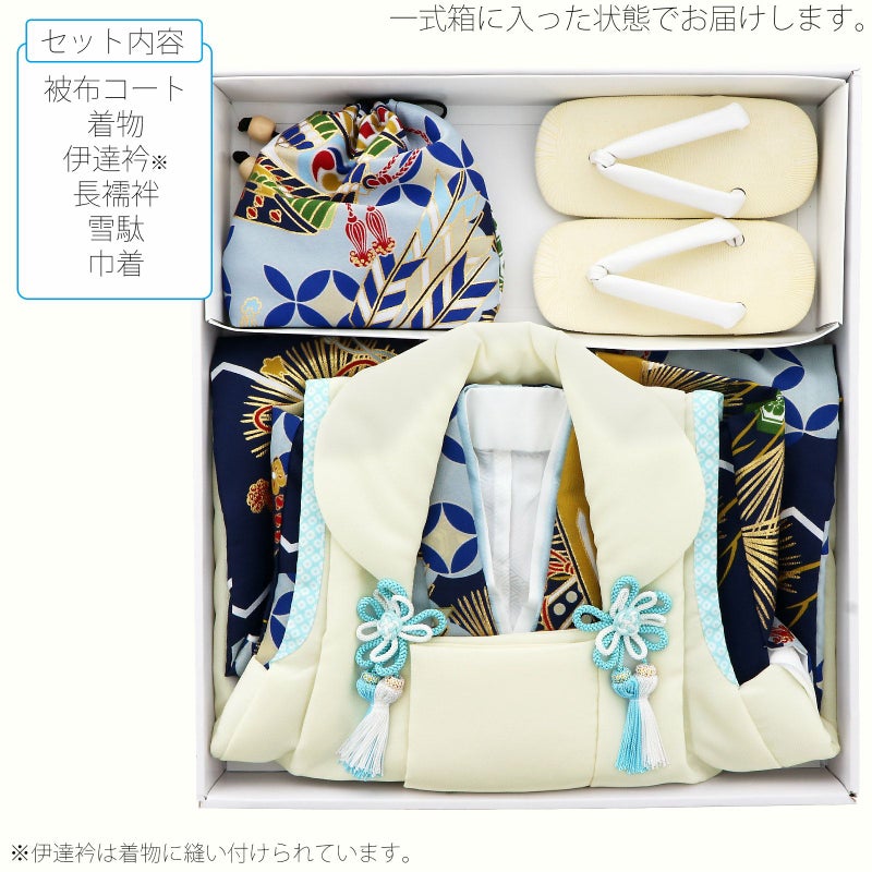 【色柄】被布コートはやわらかい白。緑色系の龍の丸と矢羽、亀甲の刺繍。肩と裾に水色の鹿の子模様のふち取り。被布飾りは白と水色の組紐。着物は紺色地に淡い水色の雲、七宝や亀甲、松葉や龍に兜、軍配などの武具。青系でまとめた中に赤や黄土色の配色、金彩。着物と共生地の巾着、白い鼻緒の草履のセット。