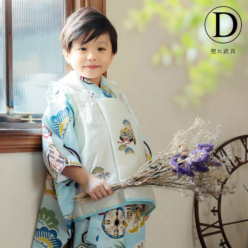 D兜に武具:被布コートはオフホワイト。落ち着いた水色を基調とした兜に松や七宝の刺繍。肩と裾に水色の鹿の子模様のふち取り。被布飾りは白の組紐の房飾り。着物は淡い水色地に鹿の子の文様。浅い緑や浅葱色の松や笹。亀甲に兜、鎧縅を中心に、丸に矢車、雪輪に桐、亀甲に花菱などの吉祥柄。白に金茶色、落ち着いた水色、浅緑、臙脂色や濃紫の配色に金彩。淡い水色の半衿、白の長襦袢には、紗綾形の地模様があります。巾着は着物と共生地です。