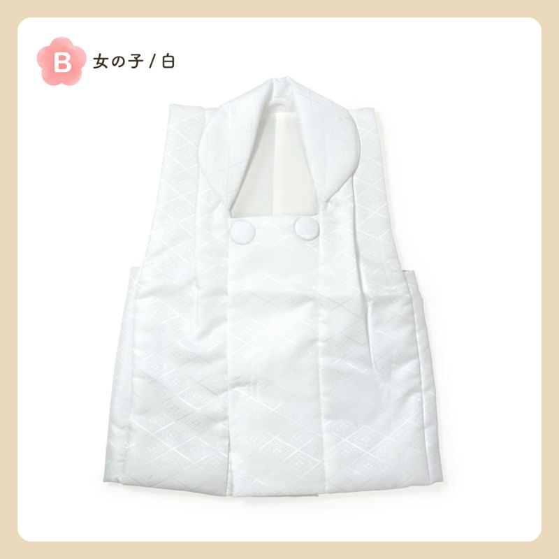 B.女の子 白:白。入れ子菱に花菱の地模様が織り出されています。ボタンは内側。