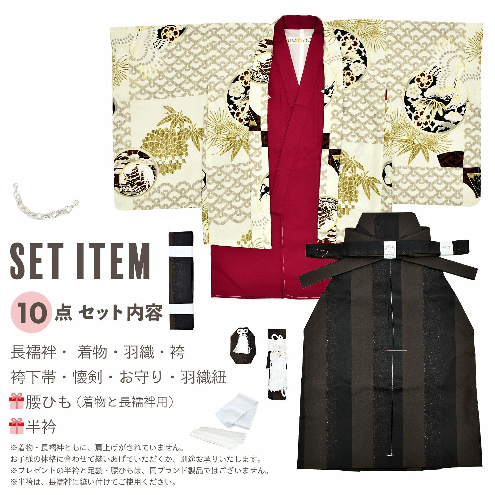他の画像を見る 送料無料 七五三の3才、5才の男の子に 羽織と着物と袴に、襦袢や小物がついた羽織袴セット 七五三 着物 男の子 3歳 ブランド 羽織袴セット JAPAN STYLE ジャパンスタイル 「アイボリー、レッド 鷹と帆船」 フルセット 3歳向け 3才 三歳 男児用 着物セット 子供着物 三才のお祝い着 【メール便不可】 きもの町価格 ¥ 110,000 税込 カートに入れる お気に入りに登録する