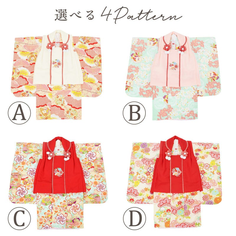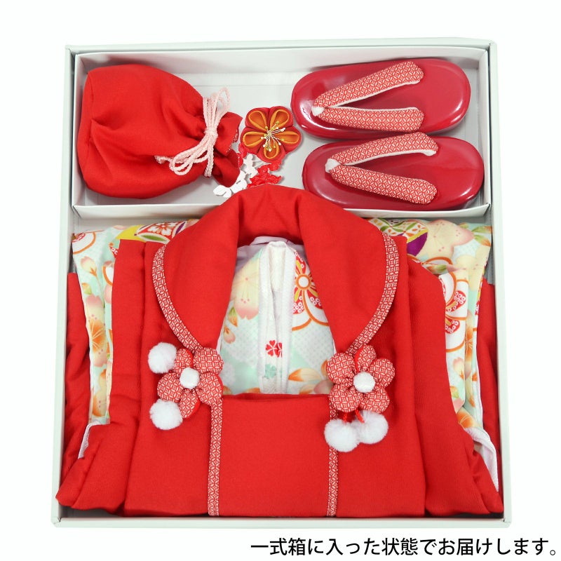 長襦袢・半衿(縫い付け済)・着物(腰ひも付き)・重ね衿(縫い付け済)・被布コート・巾着・草履・髪飾り・化粧箱のセットです。