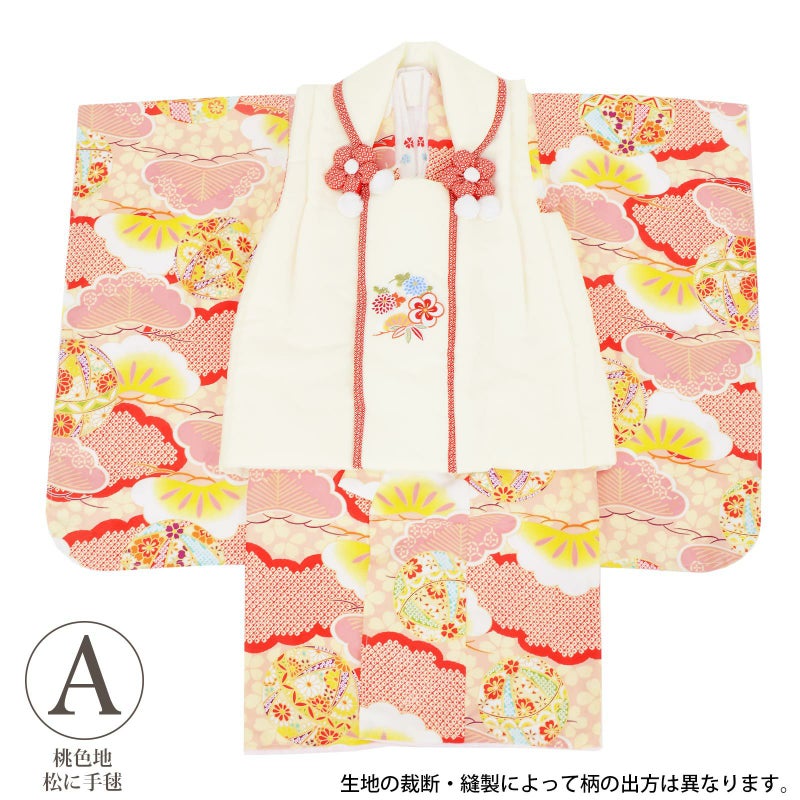 A. 桃色地 松に手毬:被布コートはオフホワイトの地に松や花々の刺繍。衿周りに赤の七宝模様のふち取り。つまみのお花とファーのポンポンの被布飾りがついています。着物はややグレイッシュなやわらかい桃色の地にクリーム色の桜文様。桜の地模様のある生地です。赤の鹿の子の雲取に、落ち着いたピンク色の松。金彩の入った細やかな文様の手毬。白地に赤や水色のお花の刺繍半衿。薄ピンクの紗綾型の地模様の長襦袢。赤色系の草履。巾着は白に返しの部分は赤地の七宝模様。