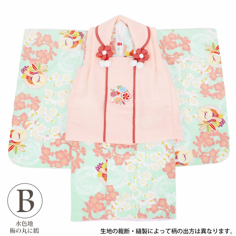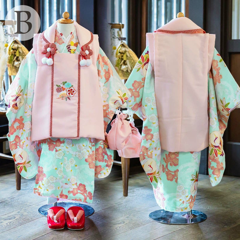 B. 水色地 梅の丸に鶴:被布コートは淡いピンクの地に松や花々の刺繍。衿周りに赤の七宝模様のふち取り。つまみのお花とファーのポンポンの被布飾りがついています。着物は淡い浅葱色系の地に白や落ち着いたピンク色の梅の丸文様。桜の地模様のある生地です。白、紫、橙などに金彩の入った鶴の丸。白地に赤や水色のお花の刺繍半衿。薄ピンクの紗綾型の地模様の長襦袢。赤色系の草履。巾着は淡いピンクに返しの部分は赤地の七宝模様。