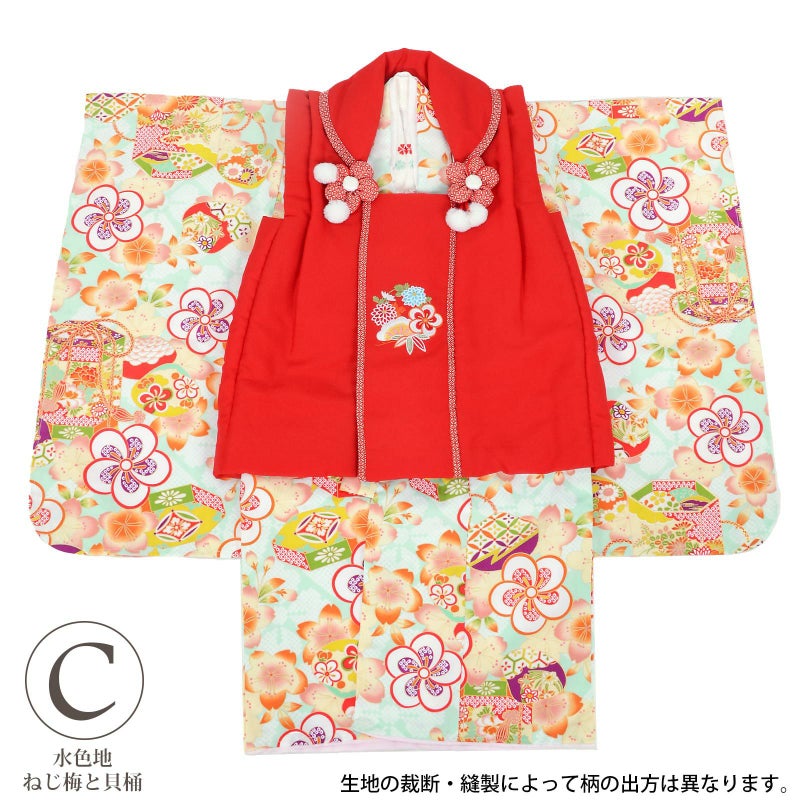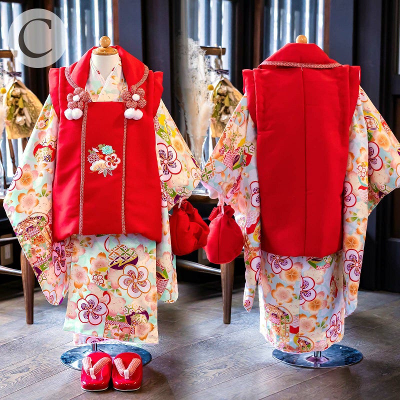 C. 水色地 ねじ梅と貝桶:被布コートは赤地に松や花々の刺繍。衿周りに赤の七宝模様のふち取り。つまみのお花とファーのポンポンの被布飾りがついています。着物は淡い浅葱色系の地、淡いベージュにピンクや橙色のぼかしの入った桜模様。桜の地模様のある生地です。金彩の入った細やかな模様の貝桶。白に赤や紫のねじ梅。白地に赤や水色のお花の刺繍半衿。薄ピンクの紗綾型の地模様の長襦袢。赤色系の草履。巾着は赤に返しの部分は赤地の七宝模様。
