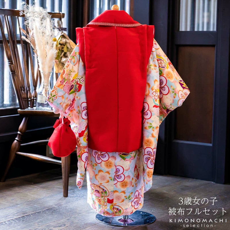 長襦袢・半衿(縫い付け済)・着物(腰ひも付き)・重ね衿(縫い付け済)・被布コート・巾着・草履・髪飾り・化粧箱のセットです。