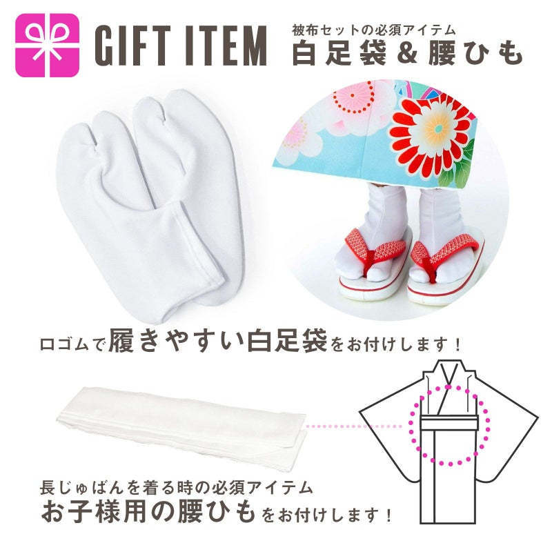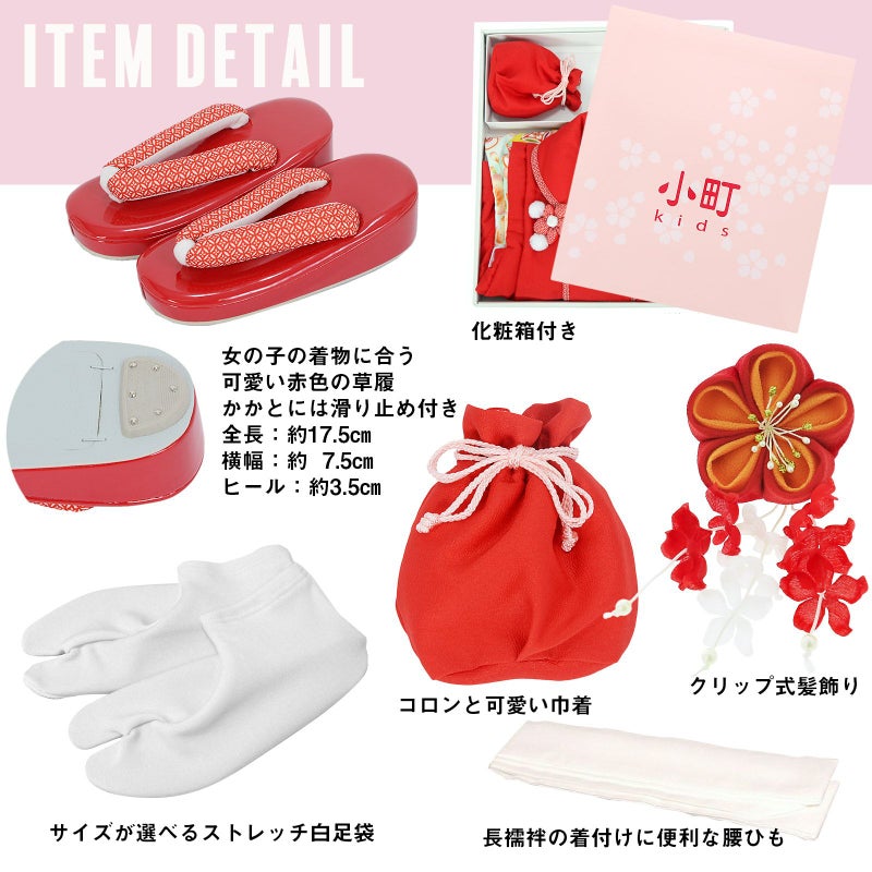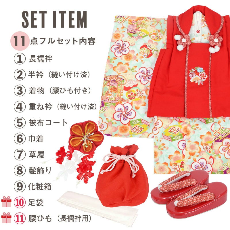 【商品内容】長襦袢・半衿(縫い付け済)・着物(腰ひも付き)・重ね衿(縫い付け済)・被布コート・巾着・草履・髪飾り・化粧箱・足袋(プレゼント)・腰ひも(長襦袢用/プレゼント)の11点セット