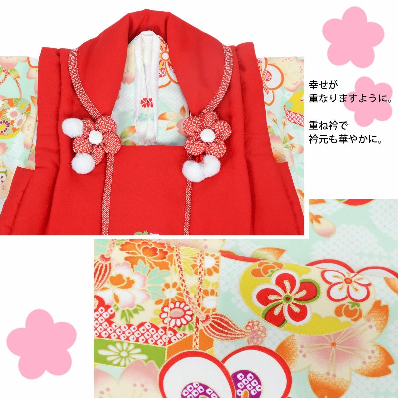 被布コートは赤地に松や花々の刺繍。衿周りに赤の七宝模様のふち取り。つまみのお花とファーのポンポンの被布飾りがついています。着物は淡い浅葱色系の地、淡いベージュにピンクや橙色のぼかしの入った桜模様。桜の地模様のある生地です。金彩の入った細やかな模様の貝桶。白に赤や紫のねじ梅。白地に赤や水色のお花の刺繍半衿。薄ピンクの紗綾型の地模様の長襦袢。赤色系の草履。巾着は赤に返しの部分は赤地の七宝模様。
