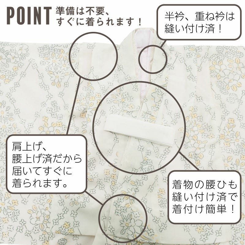 伊達衿は着物に、半衿は襦袢にそれぞれ縫い付けられています。着物に腰紐も縫い付けられていますので、着付けも簡単!すぐにお召しいただけます。