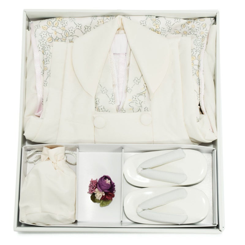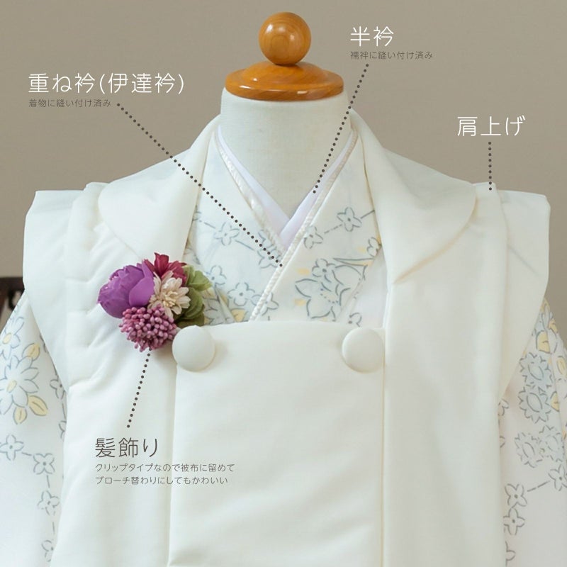 長襦袢・半衿(縫い付け済)・着物(腰ひも付き)・重ね衿(縫い付け済)・被布コート・巾着・草履・髪飾り・化粧箱のセットです。