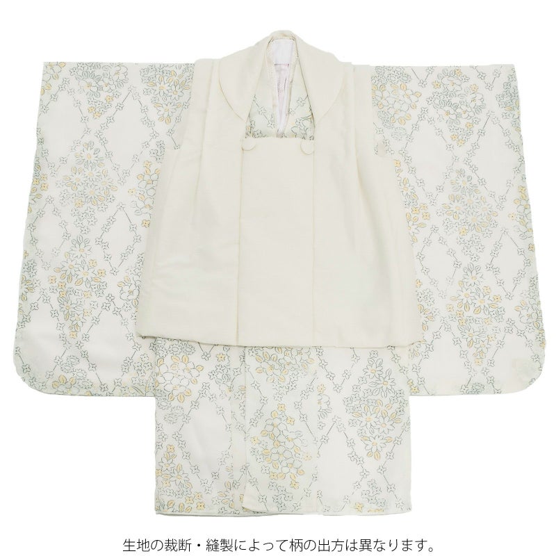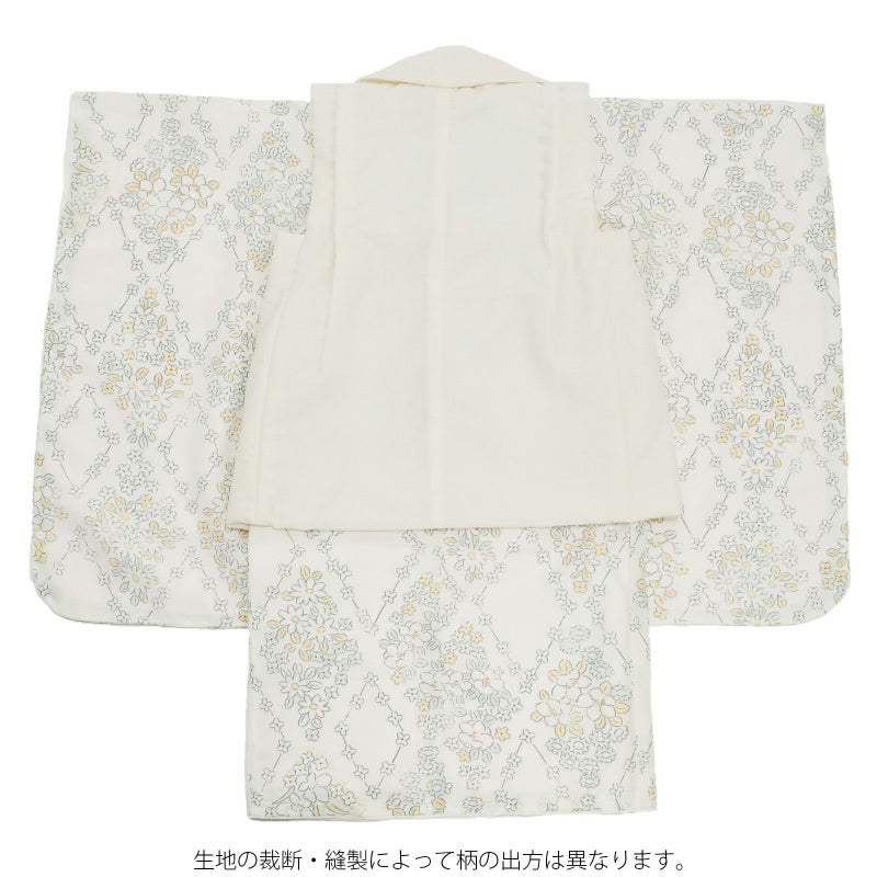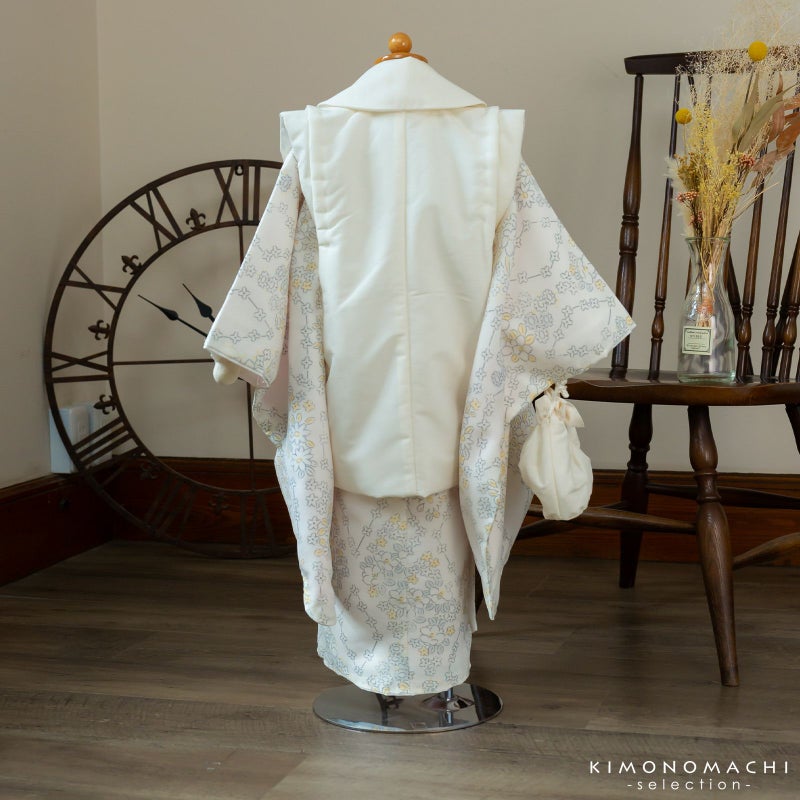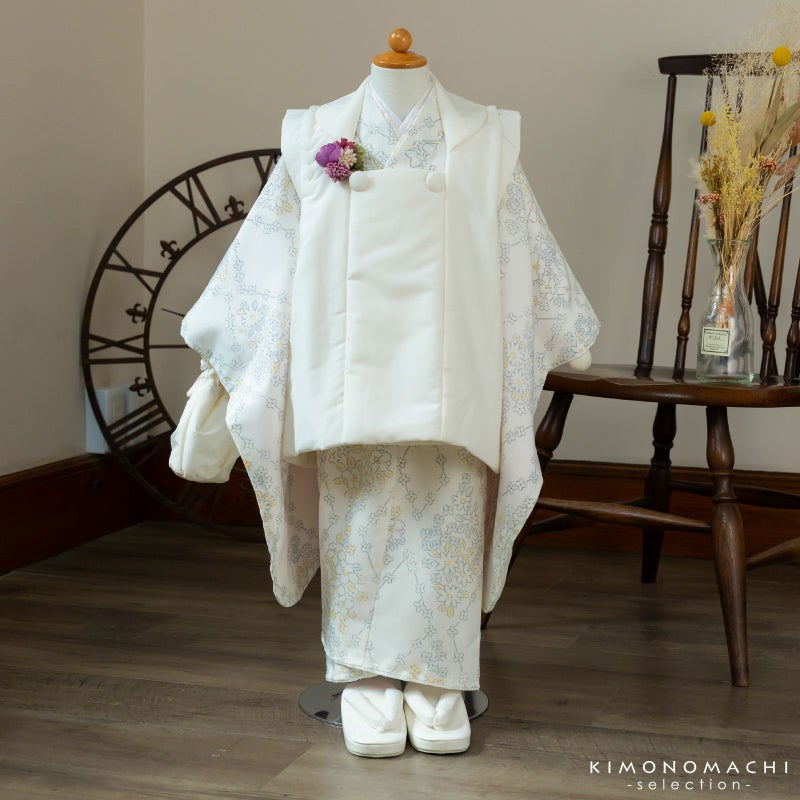 被布コートはやわらかい白色、横に節の入ったシャンタン風の生地。くるみボタンの被布飾りがついています。着物はオフホワイトの地、グレーの線に淡いグレー、たまご色で表現された花々がダイヤ型に配置されています。重ね衿はクリーム色。長襦袢は淡いピンク色に紗綾型の地模様。白い半衿が付いています。巾着は被布と共生地。赤紫色系のコサージュ髪飾り。草履は白い台にオフホワイトの鼻緒。