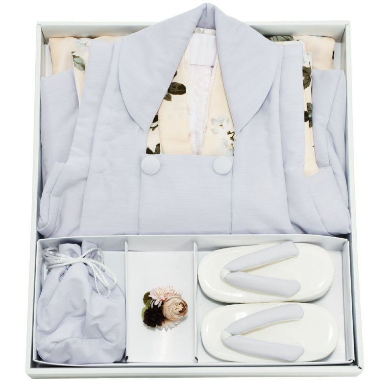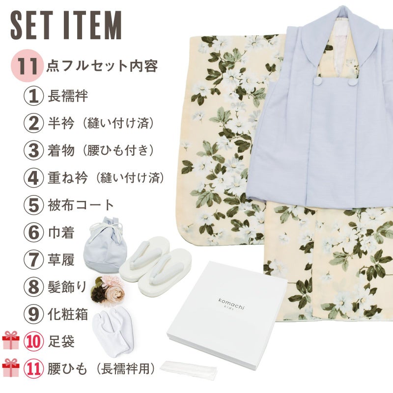 【商品内容】長襦袢・半衿(縫い付け済)・着物(腰ひも付き)・重ね衿(縫い付け済)・被布コート・巾着・草履・髪飾り・化粧箱・足袋(プレゼント)・腰ひも(長襦袢用/プレゼント)の11点セット